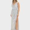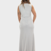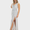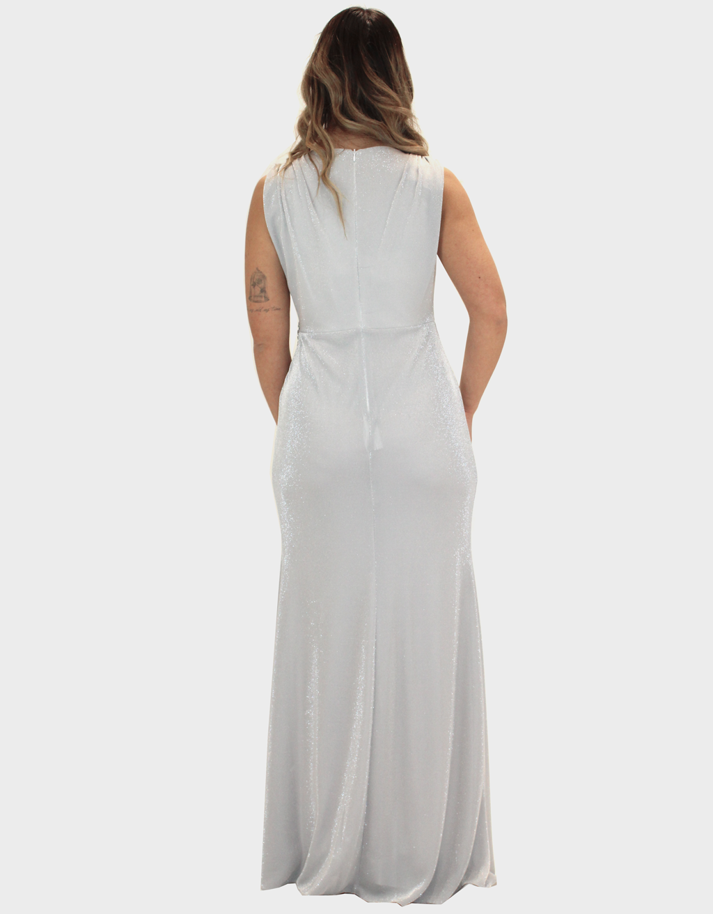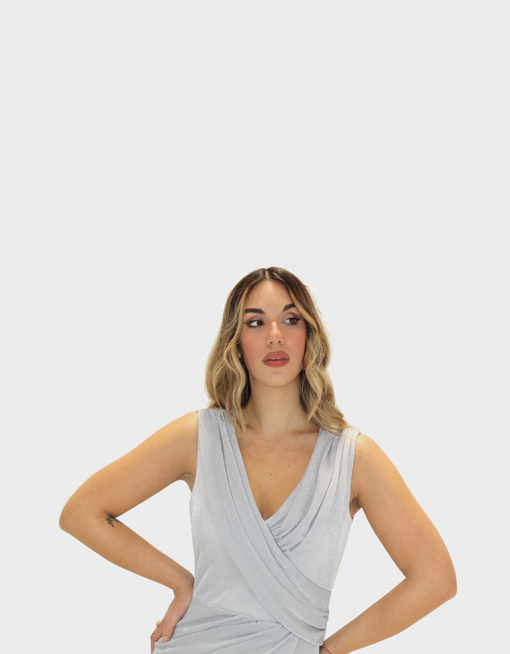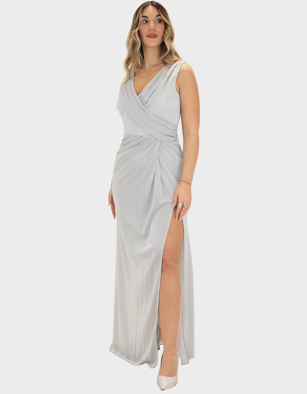 Il nuovo abito argento della nuova collezione di Sharon lungo dal design raffinato e luminoso, realizzato in tessuto lurex che cattura la luce con eleganza. Il modello a giromanica presenta uno scollo a V che valorizza il décolleté con femminilità e armonia. La linea segue la silhouette in modo naturale, mentre lo spacco dona movimento e un tocco sensuale. Il drappeggio sul davanti arricchisce il capo con un raffinato gioco di volumi, studiato per slanciare la figura. Un abito ideale per eventi serali, cerimonie e occasioni speciali dal carattere glamour.