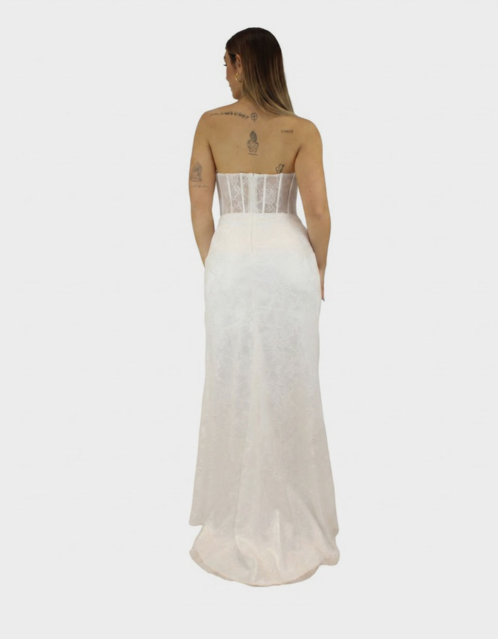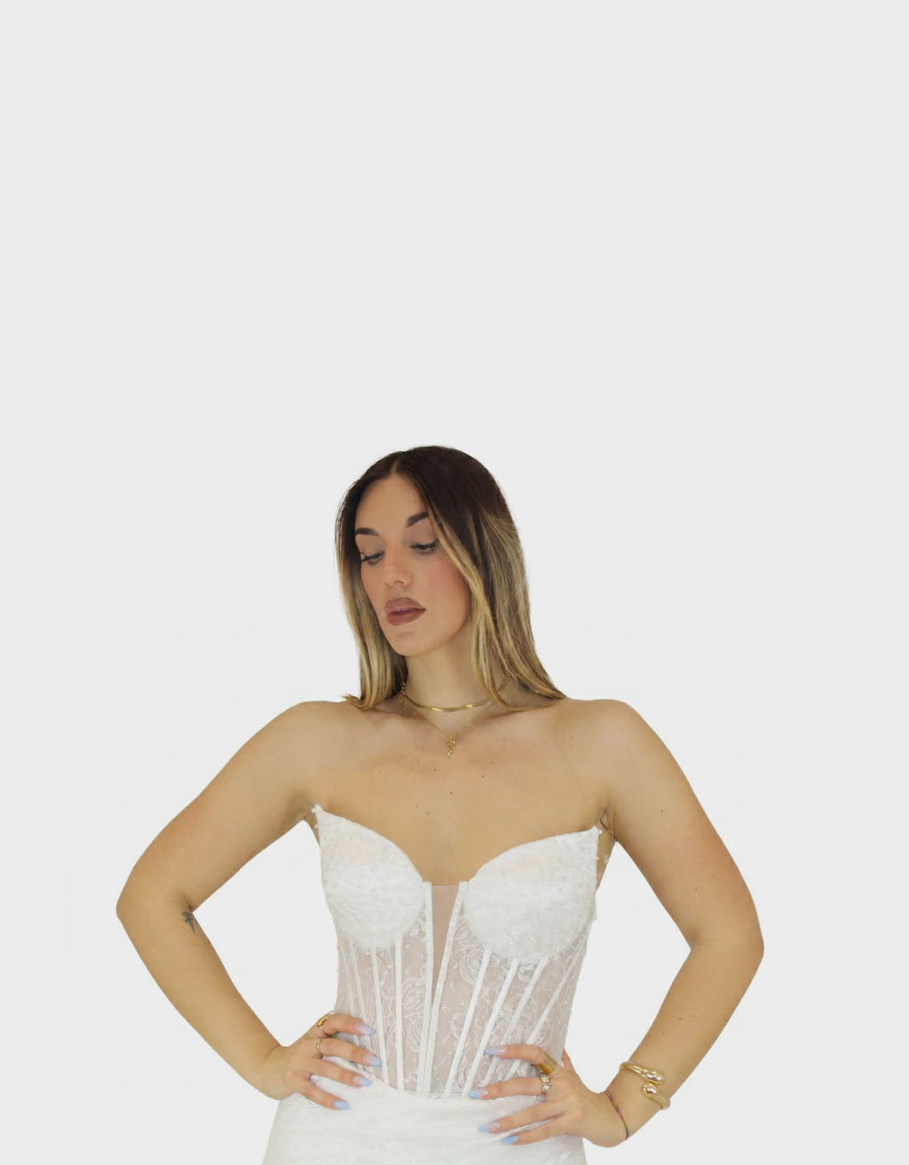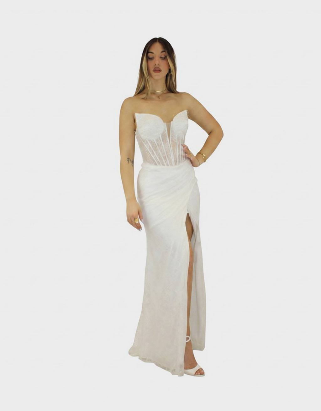 Il nuovo abito bianco della nuova collezione di Elizabeth Moda è romantico e sofisticato, questo abito in pizzo francese è l’espressione perfetta di femminilità e charme senza tempo. Realizzato interamente in pregiato pizzo, avvolge la silhouette con delicatezza, creando un effetto elegante e ricercato. Lo scollo a cuore valorizza il décolleté con grazia, donando un tocco sensuale ma sempre raffinato. La linea segue armoniosamente le forme, mentre lo spacco a portafoglio aggiunge movimento e leggerezza, lasciando intravedere la gamba con discreta eleganza. Perfetto per cerimonie, eventi speciali o serate importanti, questo abito è pensato per chi desidera distinguersi con stile, puntando su dettagli preziosi e una lavorazione di alta qualità.