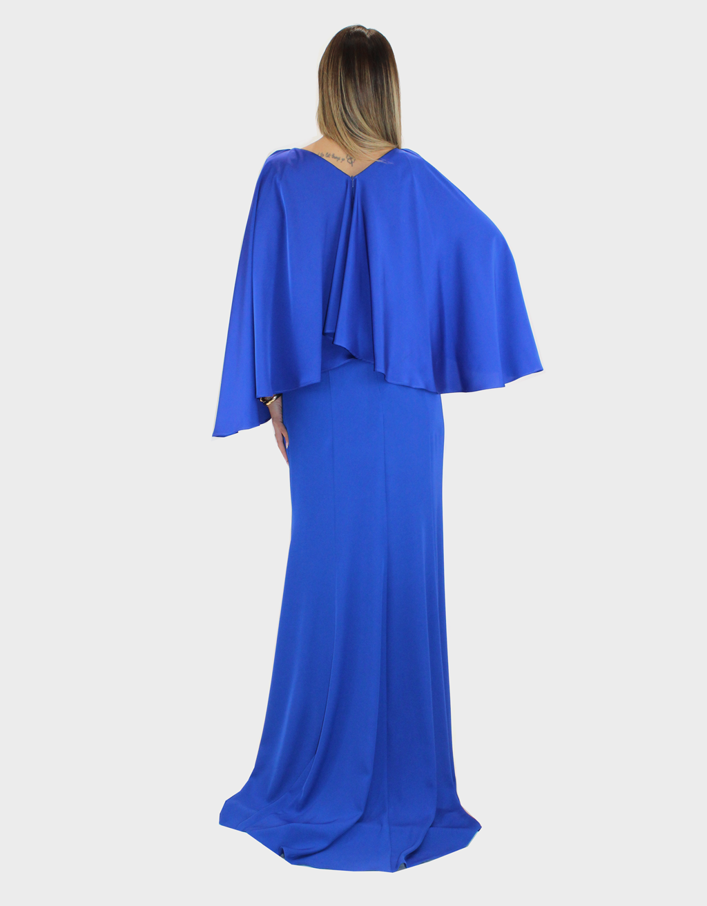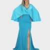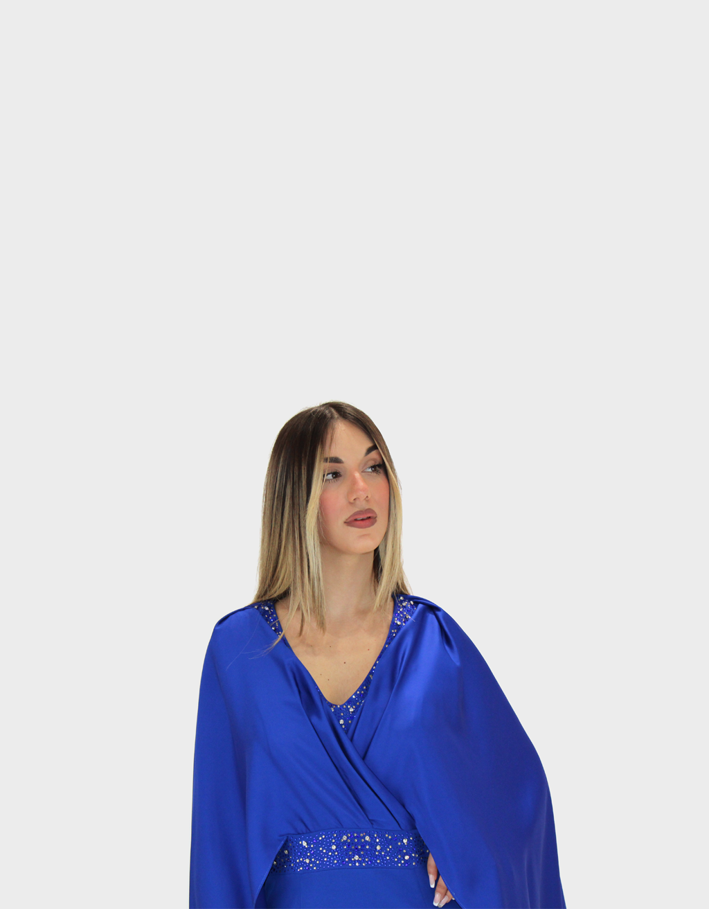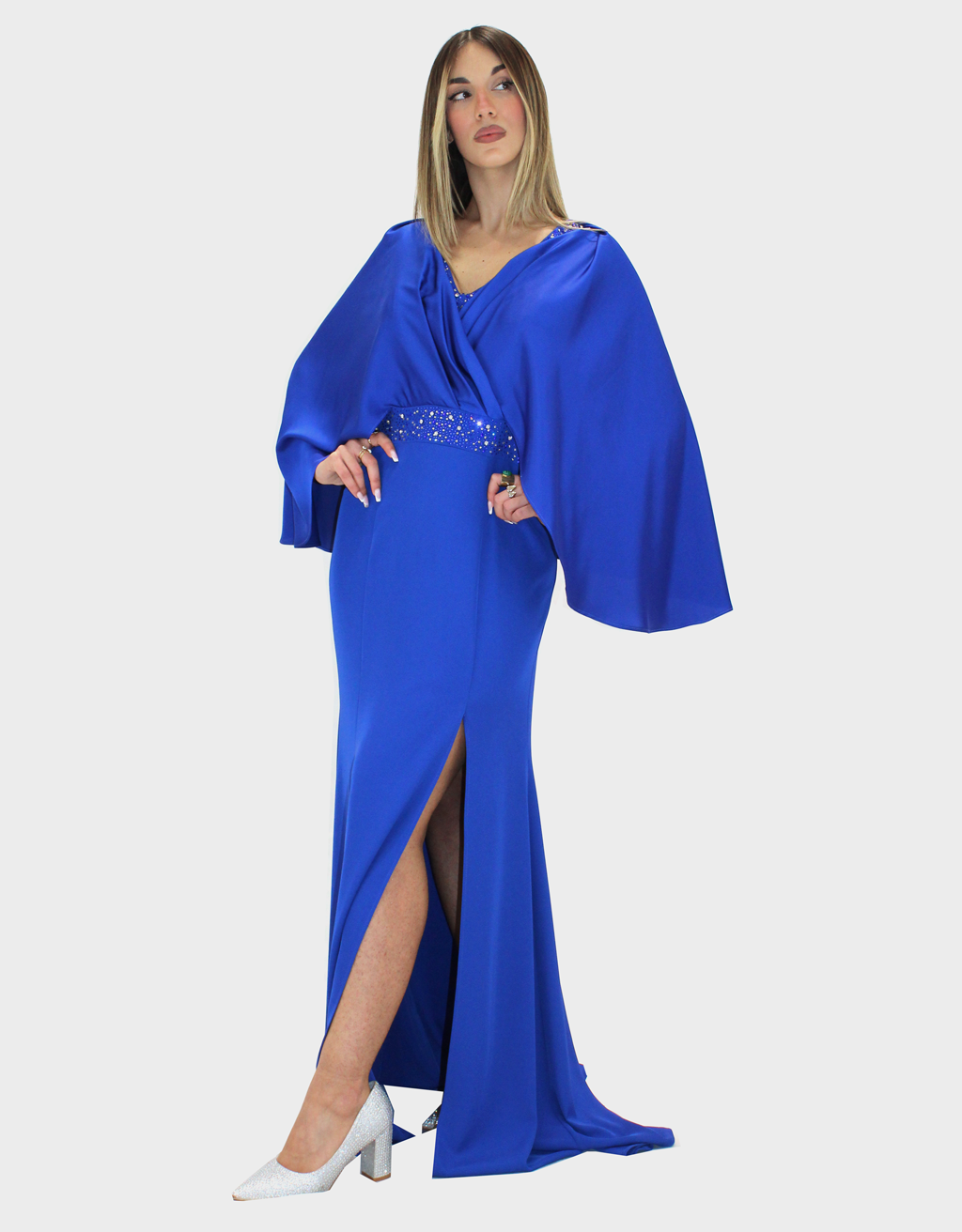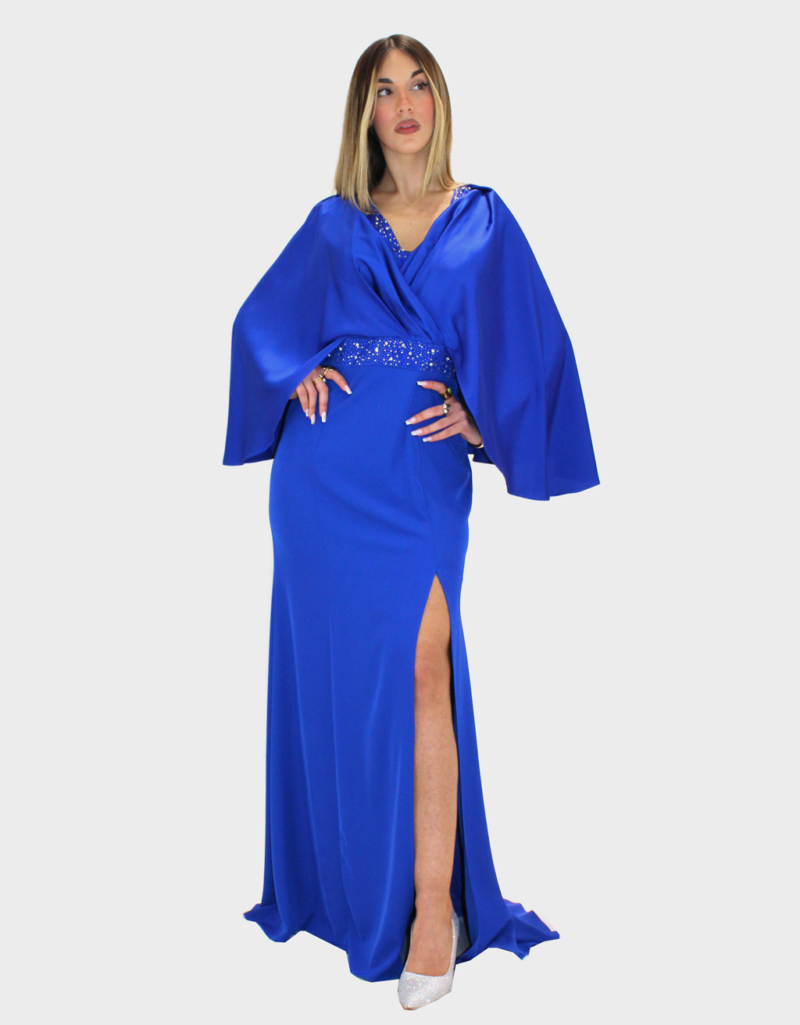 Il nuovo abito blu della nuova collezione di Ludovica Hassler è di straordinaria eleganza, pensato per chi desidera un look sofisticato e di grande impatto. Il design si distingue per la cappa in raso, fluida e luminosa, che avvolge delicatamente le spalle donando regalità e movimento alla figura. La gonna semi aderente in Cady valorizza la silhouette con equilibrio e armonia, seguendo le forme in modo naturale senza risultare eccessiva. Il contrasto tra la morbidezza del raso e la struttura del Cady crea un effetto raffinato e ricercato. A impreziosire il capo, delicati dettagli in strass illuminano l’abito con punti luce sofisticati, aggiungendo un tocco glamour senza perdere in classe. Perfetto per cerimonie importanti, eventi serali e occasioni speciali in cui distinguersi con stile e femminilità.