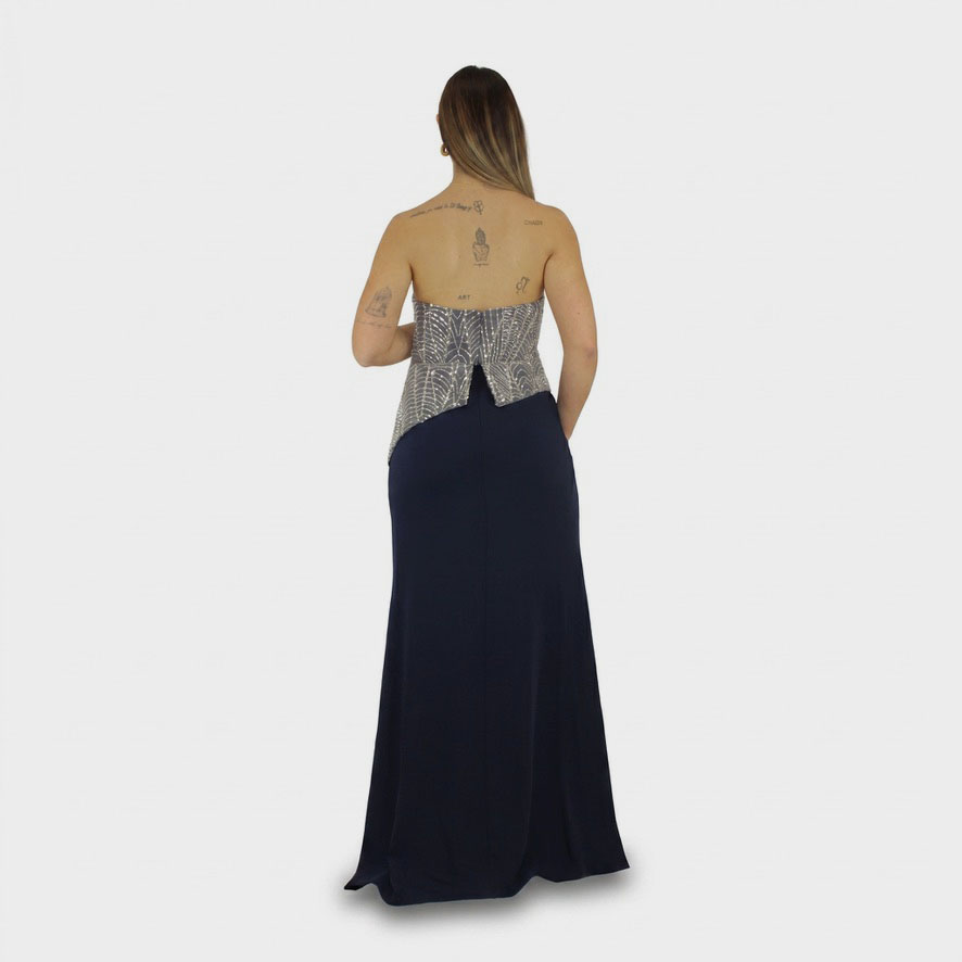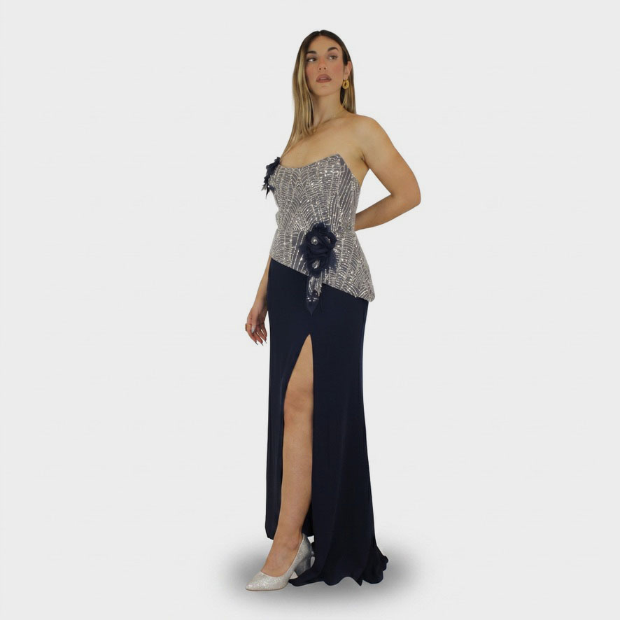 Il nuovo abito blu notte della nuova collezione di Elizabeth Moda è elegante e femminile, questo abito conquista con linee armoniose e dettagli luminosi. Lo scollo a cuore valorizza il décolleté con delicatezza, donando un tocco romantico e sofisticato. Il corsetto, interamente impreziosito da strass scintillanti, cattura la luce ad ogni movimento, esaltando il busto con un effetto brillante e raffinato. La gonna semi aderente segue la silhouette con naturalezza, offrendo una vestibilità confortevole ma allo stesso tempo slanciata ed elegante. Un equilibrio perfetto tra sensualità e classe, ideale per cerimonie, eventi serali o occasioni speciali in cui distinguersi con stile.