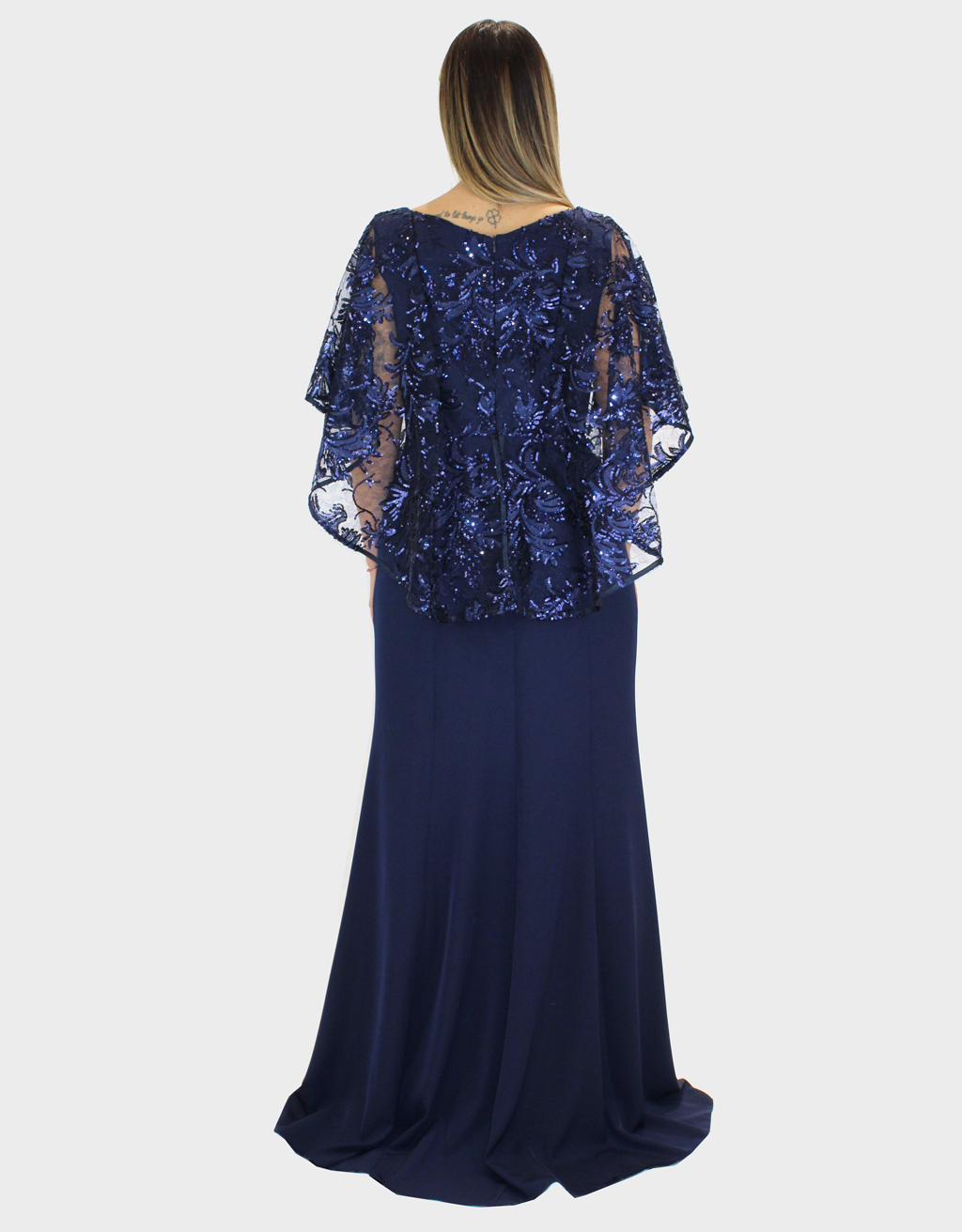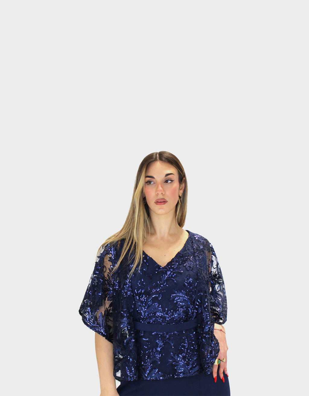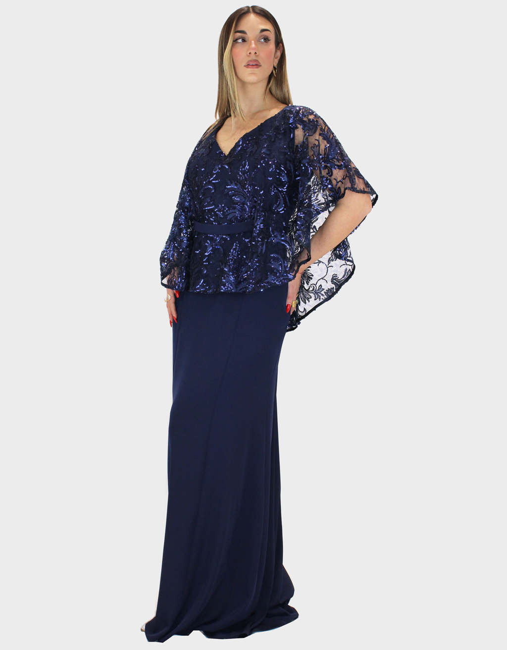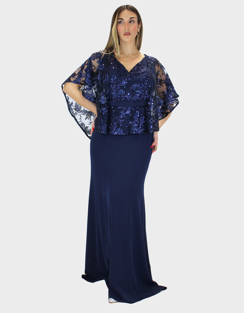 Il nuovo abito blu notte della collezione di Sharon è dal fascino raffinato e femminile, caratterizzato da una baschina che valorizza il punto vita e definisce armoniosamente la silhouette. Il corpetto, interamente ricamato e impreziosito da brillanti luminosi, cattura la luce con eleganza, creando un effetto prezioso e ricercato. La scollatura, sensuale ma equilibrata, esalta il décolleté con grande raffinatezza. La gonna in Cady, dalla linea semi aderente, scivola delicatamente lungo le forme garantendo comfort e vestibilità impeccabile. Le maniche a fazzoletto, leggere e fluide, donano movimento e un tocco etereo all’abito, completando il design con grazia e romanticismo. Un modello pensato per cerimonie ed eventi speciali, ideale per chi desidera un look sofisticato, luminoso e senza tempo.