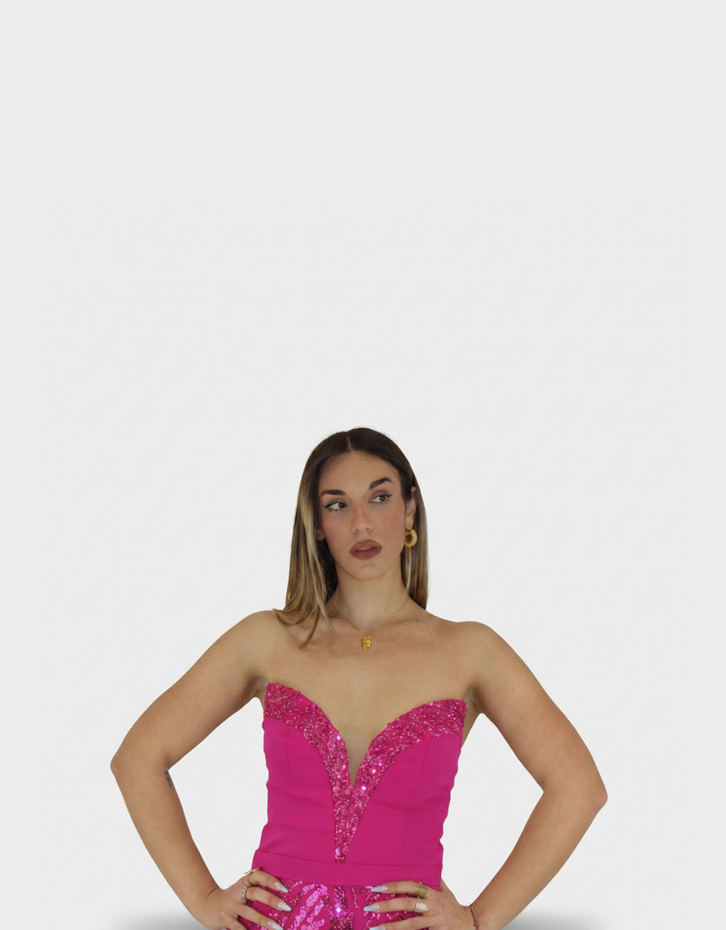 Il nuovo abito fucsia della nuova collezione di Elizabeth Moda è audace e sofisticato, questo abito a sirena è pensato per esaltare la silhouette con un’eleganza moderna e decisa. La linea aderente segue le forme con precisione, aprendosi delicatamente sul fondo e arricchita da uno spacco sensuale che slancia la figura e dona movimento. La gonna, interamente decorata con paillettes luminose, cattura la luce ad ogni passo, creando un effetto scintillante e glamour. In contrasto, il corsetto in crêpe dallo scollo a cuore dona struttura e raffinatezza, valorizzando il décolleté con un tocco elegante e femminile. Il mix tra la texture opaca del crêpe e la brillantezza delle paillettes rende questo abito unico e di grande impatto visivo. Perfetto per eventi serali, cerimonie o occasioni speciali, è la scelta ideale per chi desidera distinguersi con stile e personalità.