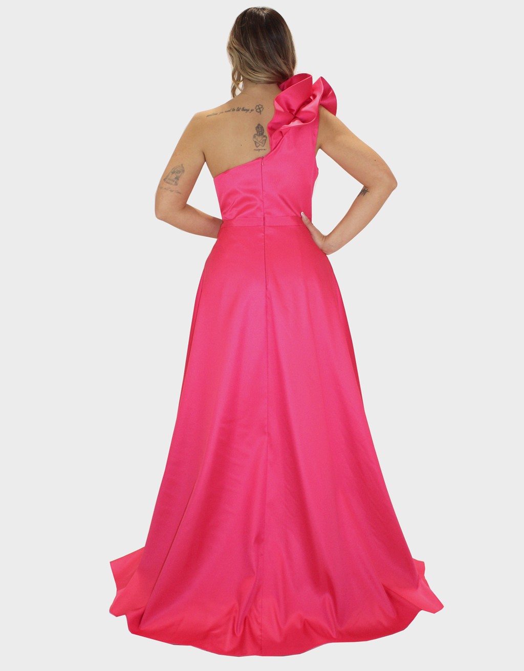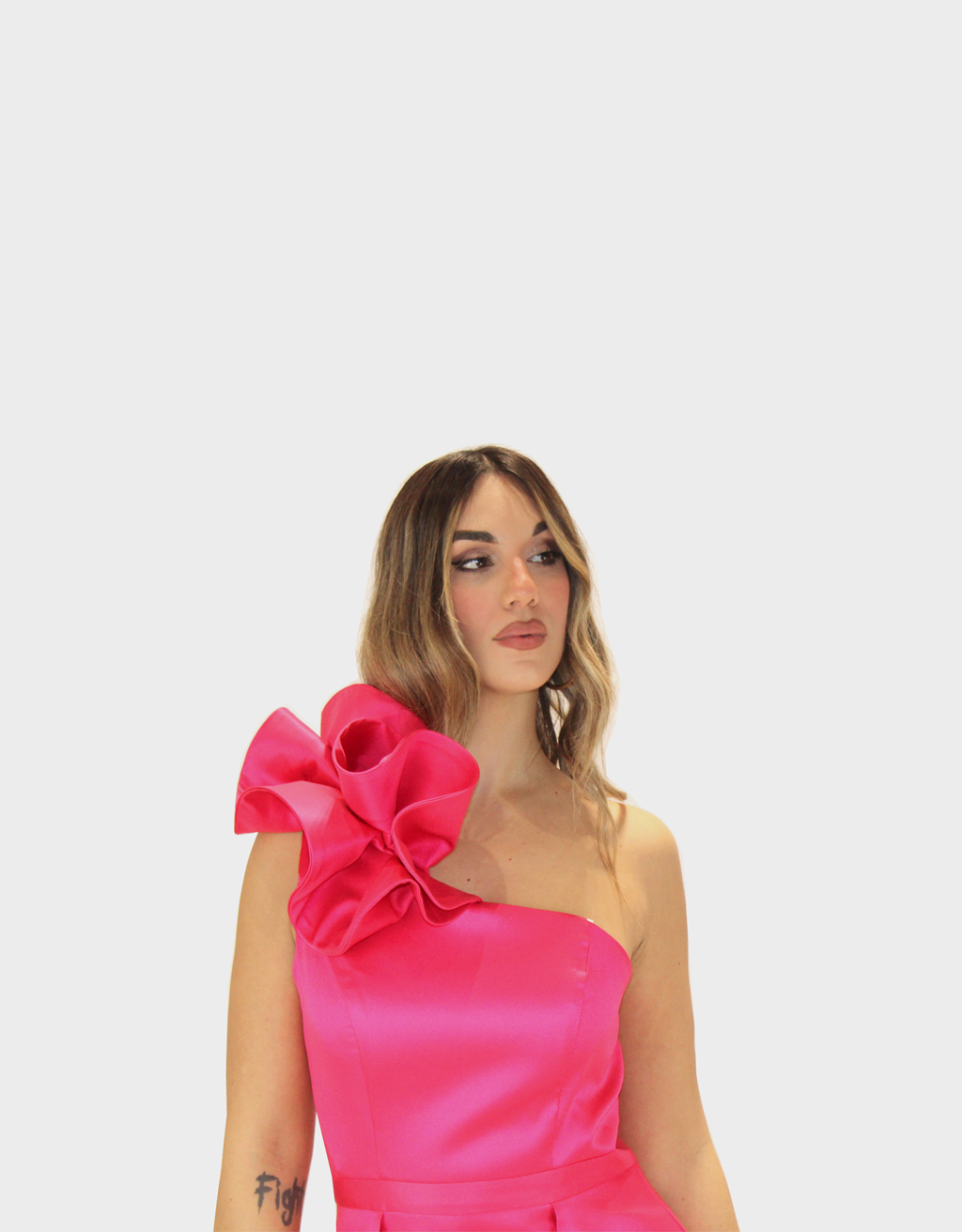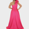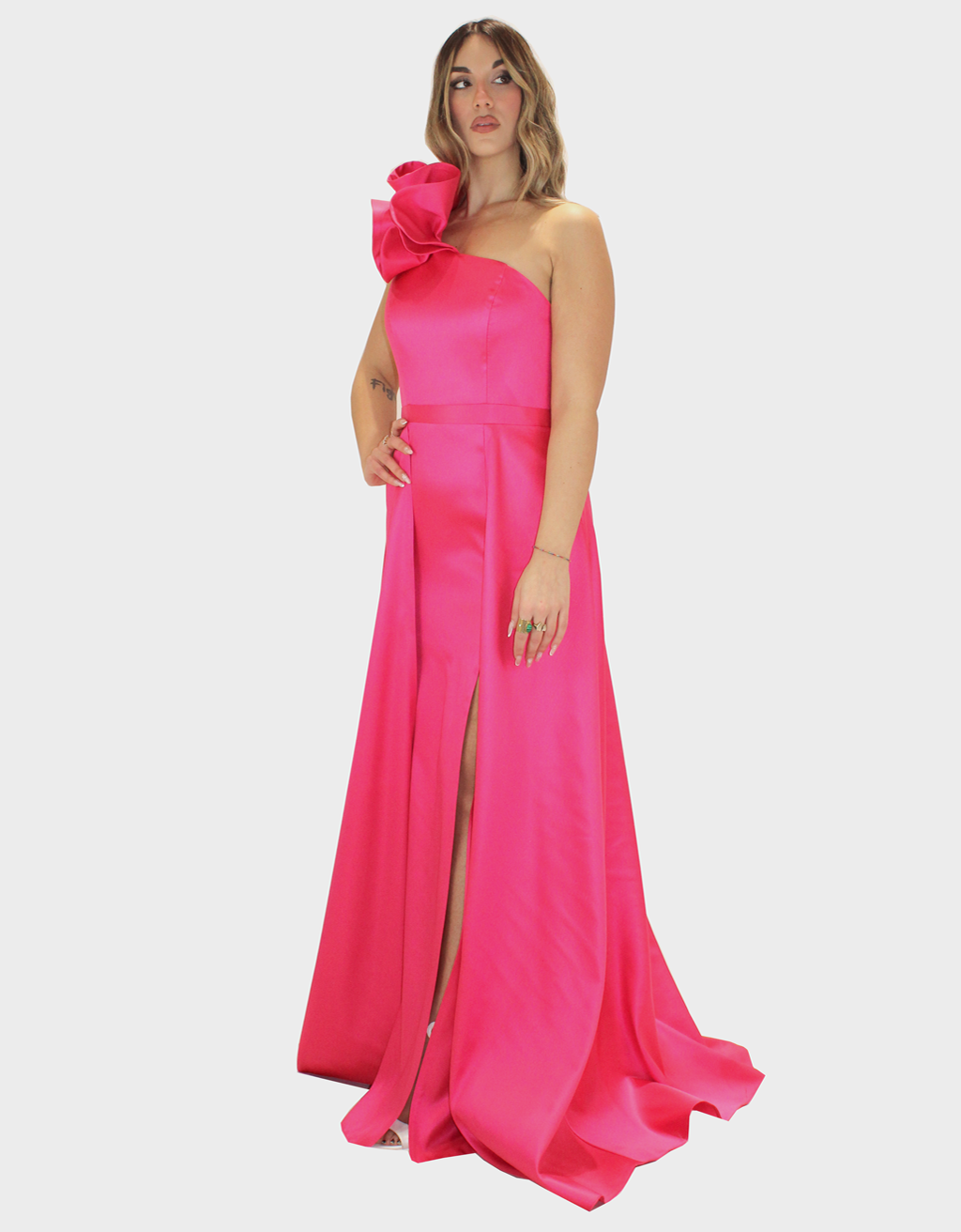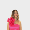 Il nuovo abito fucsia della nuova collezione di Sharon è raffinato e di grande impatto scenico realizzato in pregiato tessuto di taffetà, noto per la sua struttura elegante e la sua luminosità naturale. Il design monospalla dona al capo un carattere moderno e sofisticato, valorizzando la linea delle spalle con femminilità. La rouche applicata arricchisce l’abito con un raffinato gioco di volumi, creando movimento e profondità e rendendo il modello unico e ricercato.