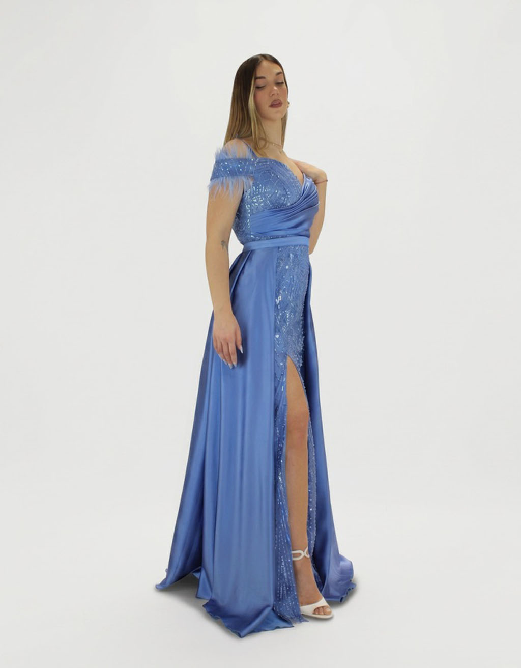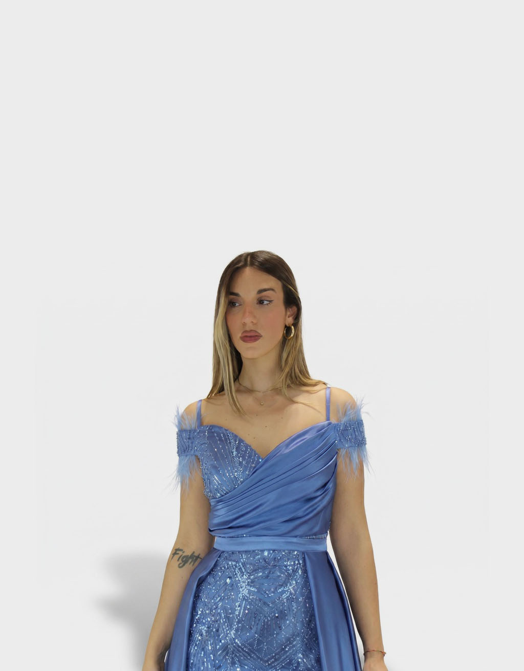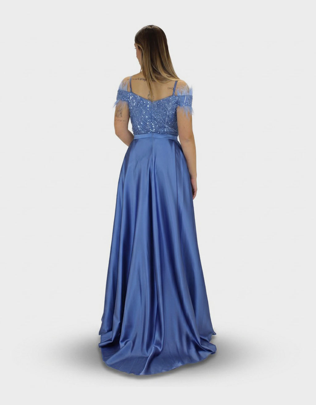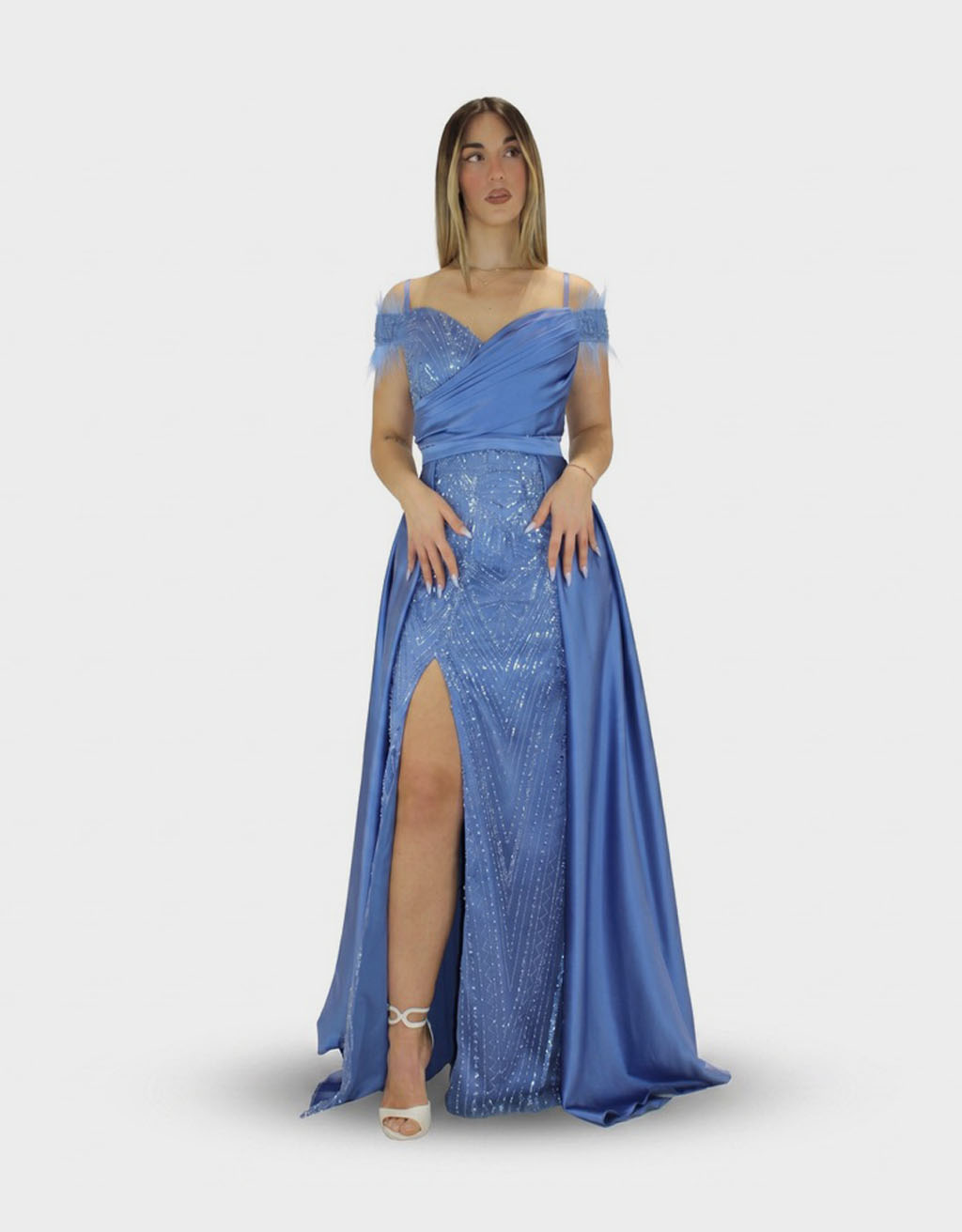 Il nuovo abito indaco della nuova collezione di Elizabeth Moda è scenografico e ultra glamour, questo abito è pensato per chi desidera brillare senza compromessi. Il design con scollo omerale valorizza le spalle con eleganza, creando un effetto sofisticato e femminile. Realizzato in tessuto interamente ricoperto di strass, il capo sprigiona luce ad ogni movimento, donando un’allure preziosa e irresistibile. Le gonnelline in raso aggiungono volume e movimento, creando un contrasto raffinato tra la brillantezza degli strass e la morbidezza del tessuto. A completare il design, le piume applicate sullo scollo regalano un tocco couture e scenografico, rendendo l’abito unico e di grande impatto visivo. Perfetto per eventi esclusivi, serate di gala o occasioni speciali, è la scelta ideale per chi vuole distinguersi con uno stile audace e sofisticato.
