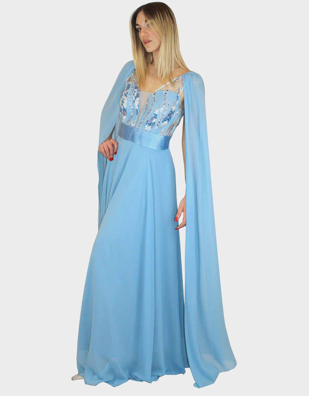 Super glamour l’abito della nuova collezione di ludovica Hassler, portatore di charme ed eleganza… L’abito presenta diverse peculiarità uniche nel suo genere… Il nuovo capo della collezione, ha una vestibilità regolare e morbida… Sulla parte superiore l’abito presenta una scollatura a ”V”, totalmente illuminata da ricami cuciti interamente a mano, cinti di paillettes… accompagnata da un corsetto sottostante con lo scollo a cuore.. Nella parte sottostante troviamo un gonnellone dalla vestibilità regolare e super morbida , accompagnato da una fascia ad altezza della vita totalmente in tessuto di raso… Ma la vera caratteristica, che permette a quest’abito di distinguersi da tutti gli altri, sono le maniche lunghe svasate, aperte, totalmente in tessuto di chiffon… Lo chiffon è un tessuto delicato e trasparente, prodotto con dei filati ritorti… è una qualità particolarmente pregiata, ed è uno dei tessuti più gettonati per la realizzazione degli abiti femminili. Questo capo è adatto a qualsiasi tipo di cerimonia e di ruolo da svolgere…