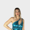 Il nuovo abito lungo verde della collezione di Elizabeth Moda è un capolavoro di eleganza e stile. Il capo presenta una vestibilità a sirena, aderente lungo il busto e i fianchi per poi allargarsi delicatamente dalla metà coscia in giù, progettata per esaltare le curve femminili in modo elegante e raffinato. La caratteristica principale di questo abito è la sua silhouette monospalla con bretelle intrecciate, decorate con strass scintillanti, si incrociano in modo intricato lungo la spalla, aggiungendo un tocco di glamour e sofisticatezza. La scollatura obliqua aggiunge un elemento di fascino e modernità, esaltando elegantemente la linea del collo e delle spalle. Un leggero spacco lungo la gamba accentua il movimento e aggiunge un tocco seducente. Questo abito è progettato per catturare l’attenzione e lasciare un’impressione duratura.