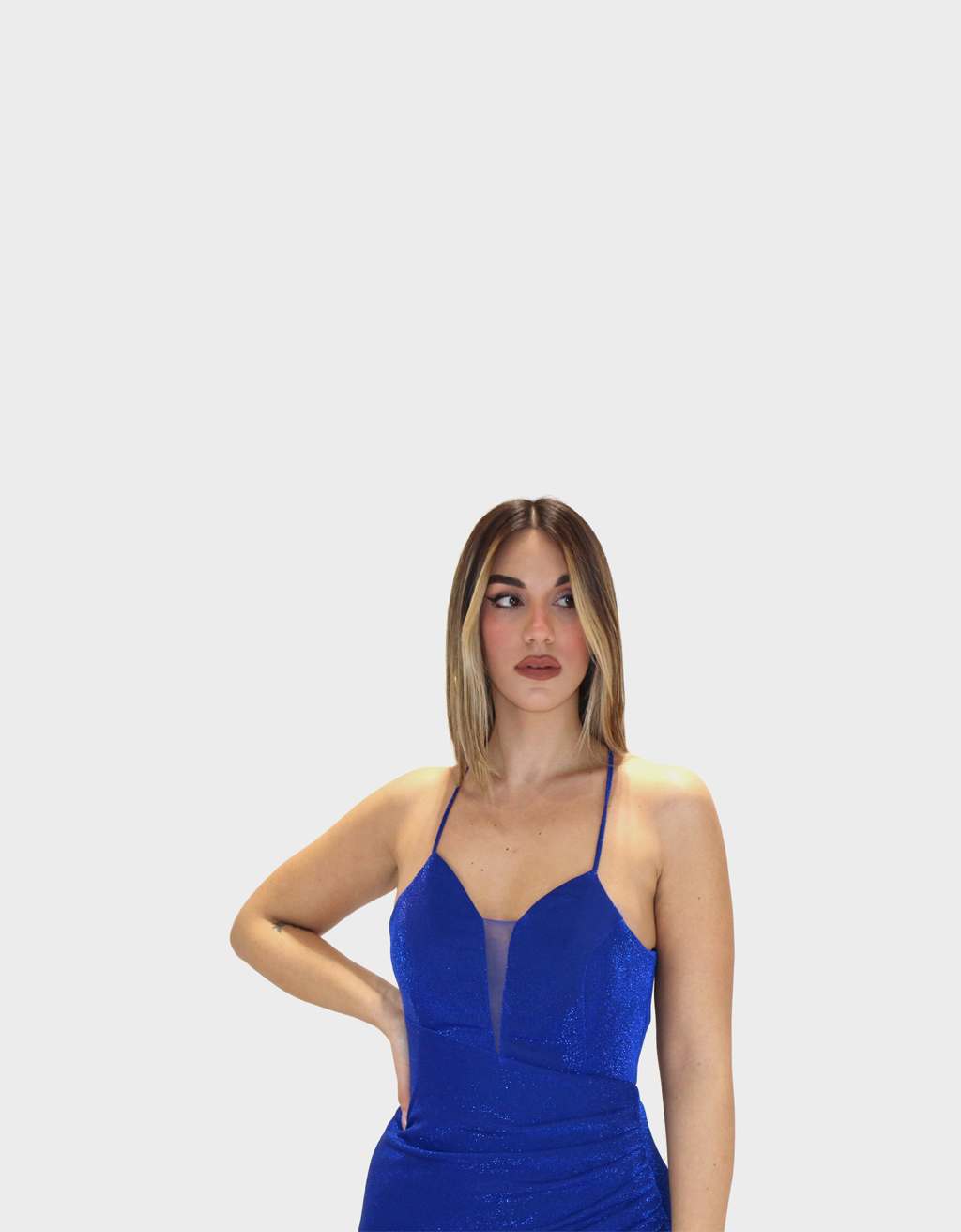 Il nuovo abito lurex blu della nuova collezione di Sharon è sensuale realizzato in tessuto lurex luminoso. Il modello presenta sottili bretelle che valorizzano la linea delle spalle e uno scollo a V profondo sul davanti, studiato per esaltare il décolleté con raffinatezza. La silhouette a sirena segue armoniosamente le forme del corpo, mentre lo spacco aggiunge femminilità e libertà di movimento. Il drappeggio sulla pancia crea un elegante gioco di volumi che slancia la figura e valorizza il punto vita. Il retro è caratterizzato da una scollatura profonda che dona un tocco audace e sofisticato. Un abito perfetto per eventi serali, cerimonie e occasioni speciali.