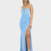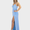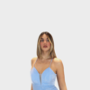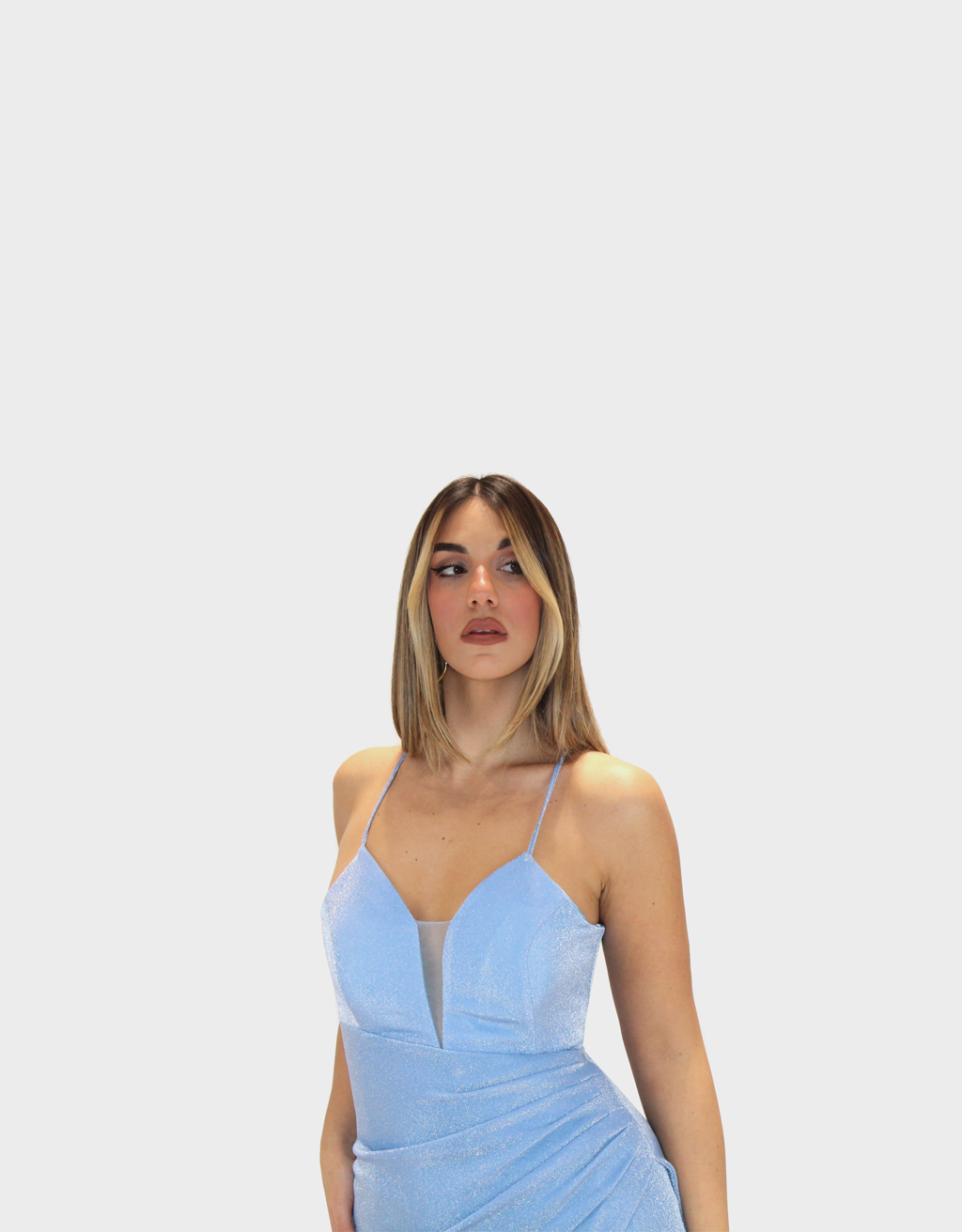 Il nuovo abito lurex polvere della nuova collezione di Sharon è sensuale realizzato in tessuto lurex luminoso. Il modello presenta sottili bretelle che valorizzano la linea delle spalle e uno scollo a V profondo sul davanti, studiato per esaltare il décolleté con raffinatezza. La silhouette a sirena segue armoniosamente le forme del corpo, mentre lo spacco aggiunge femminilità e libertà di movimento. Il drappeggio sulla pancia crea un elegante gioco di volumi che slancia la figura e valorizza il punto vita. Il retro è caratterizzato da una scollatura profonda che dona un tocco audace e sofisticato. Un abito perfetto per eventi serali, cerimonie e occasioni speciali.