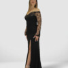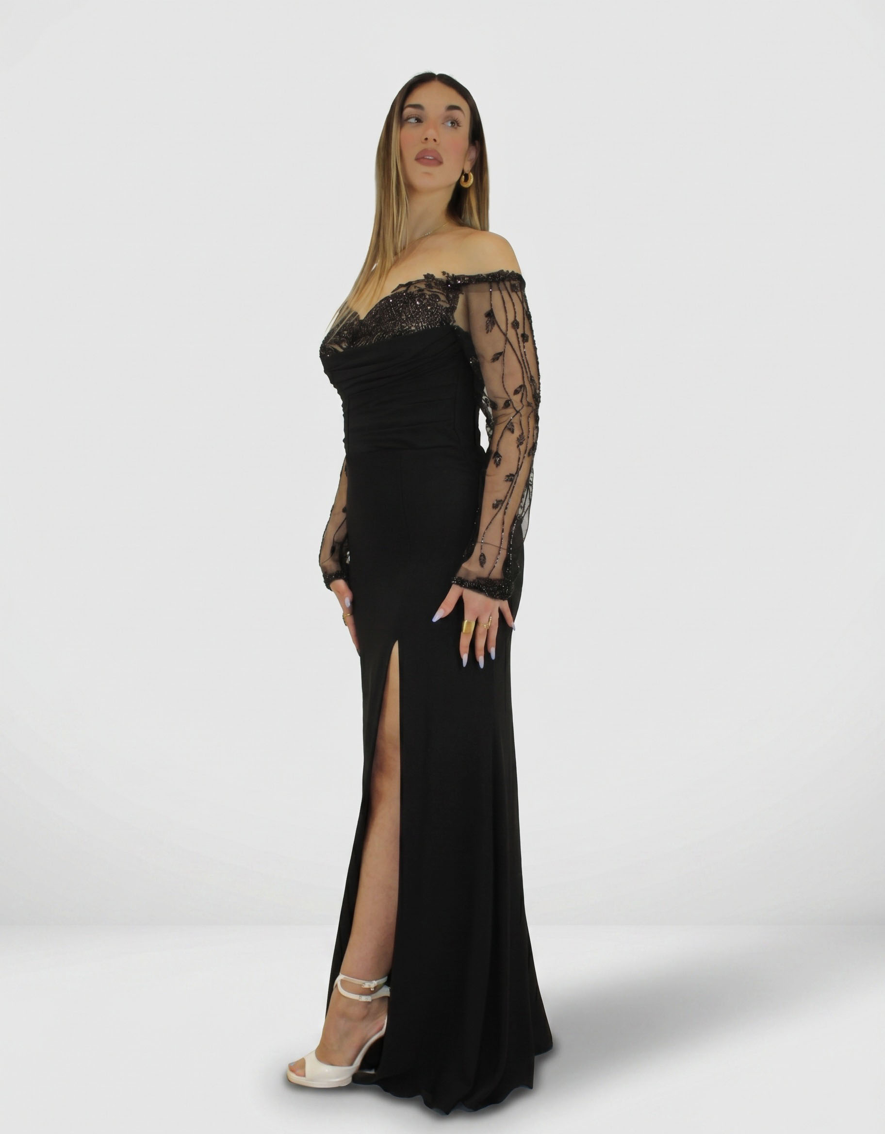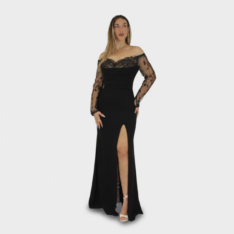 Il nuovo abito nero della nuova collezione di Elizabeth Moda è leggero e sofisticato, questo abito a semi sirena in chiffon incarna un’eleganza delicata e senza tempo. La silhouette accarezza le forme con naturalezza, aprendosi leggermente sul fondo per un effetto fluido e armonioso. Lo scollo omerale valorizza con grazia la linea delle spalle, mentre la manica si distingue per i raffinati ricami impreziositi da strass luminosi, che donano un tocco di luce discreta e ricercata. Il contrasto tra la leggerezza eterea dello chiffon e i dettagli brillanti crea un equilibrio perfetto tra romanticismo e glamour. Ideale per cerimonie, eventi eleganti o serate speciali, questo abito è la scelta perfetta per chi desidera un look femminile, raffinato e di grande classe.
