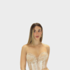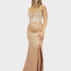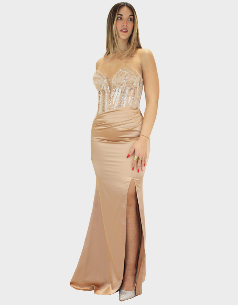 Il nuovo abito oro della collezione di Elizabeth Moda è dal carattere deciso e sofisticato, pensato per valorizzare la femminilità con dettagli preziosi. Il corsetto strutturato definisce il busto con eleganza, mentre lo scollo a cuore mette in risalto il décolleté con un tocco romantico e sensuale. Il corpetto è interamente arricchito da paillettes luminose, che donano brillantezza e profondità al design, catturando la luce a ogni movimento. La gonna in raso, fluida e setosa, è impreziosita da un raffinato drappeggio che esalta la silhouette, accompagnato da uno spacco laterale che aggiunge dinamismo e un’allure seducente. Un abito ideale per cerimonie ed eventi serali, perfetto per chi desidera un look elegante, scenografico e di grande impatto.