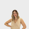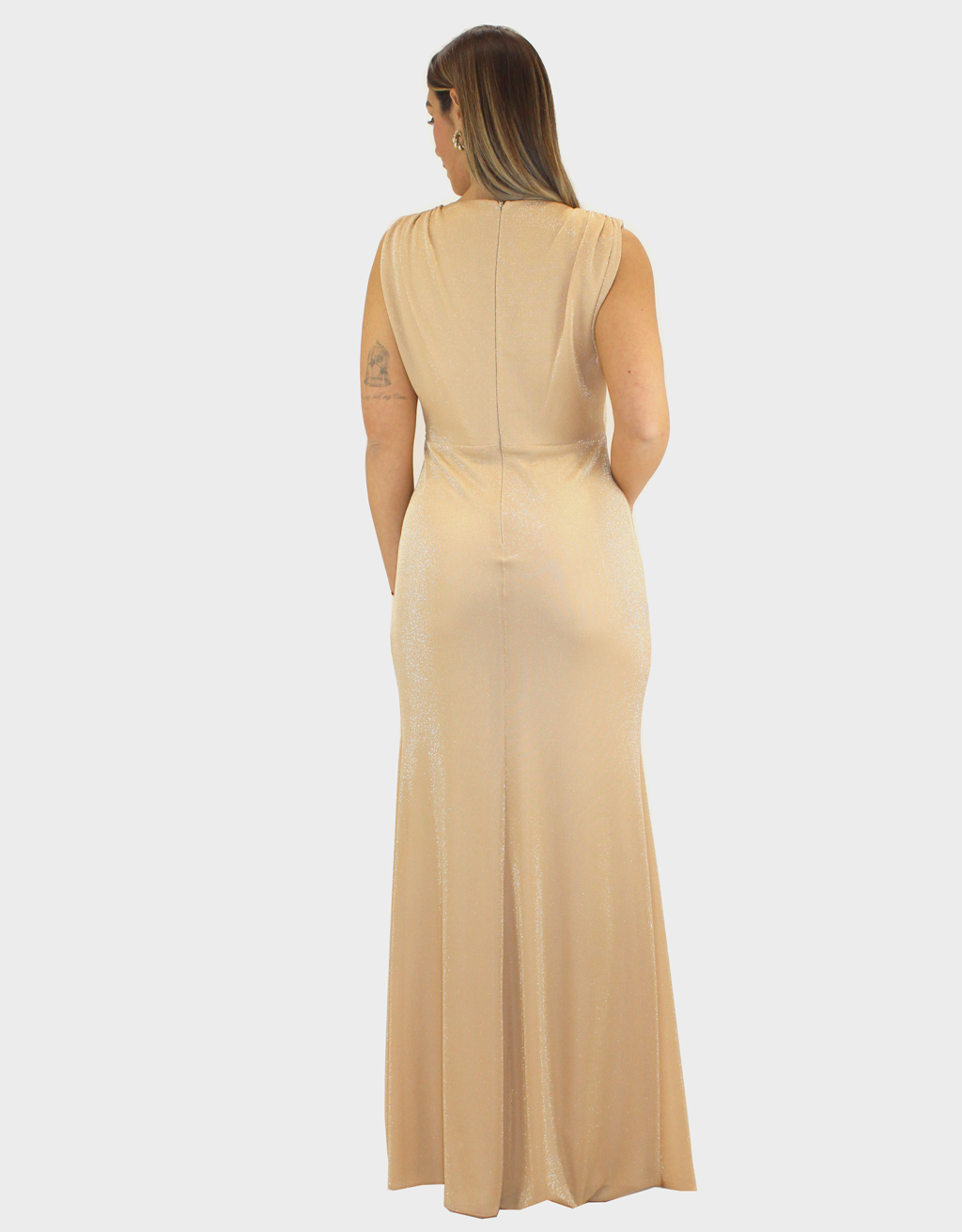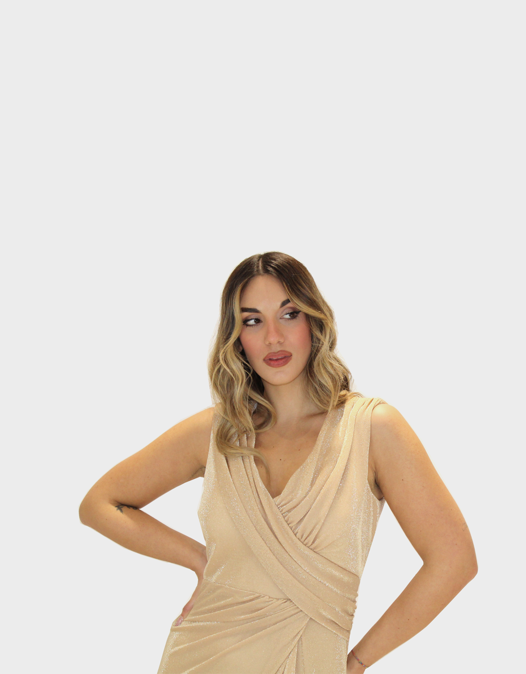 Il nuovo abito oro della nuova collezione di Sharon lungo dal design raffinato e luminoso, realizzato in tessuto lurex che cattura la luce con eleganza. Il modello a giromanica presenta uno scollo a V che valorizza il décolleté con femminilità e armonia. La linea segue la silhouette in modo naturale, mentre lo spacco dona movimento e un tocco sensuale. Il drappeggio sul davanti arricchisce il capo con un raffinato gioco di volumi, studiato per slanciare la figura. Un abito ideale per eventi serali, cerimonie e occasioni speciali dal carattere glamour.