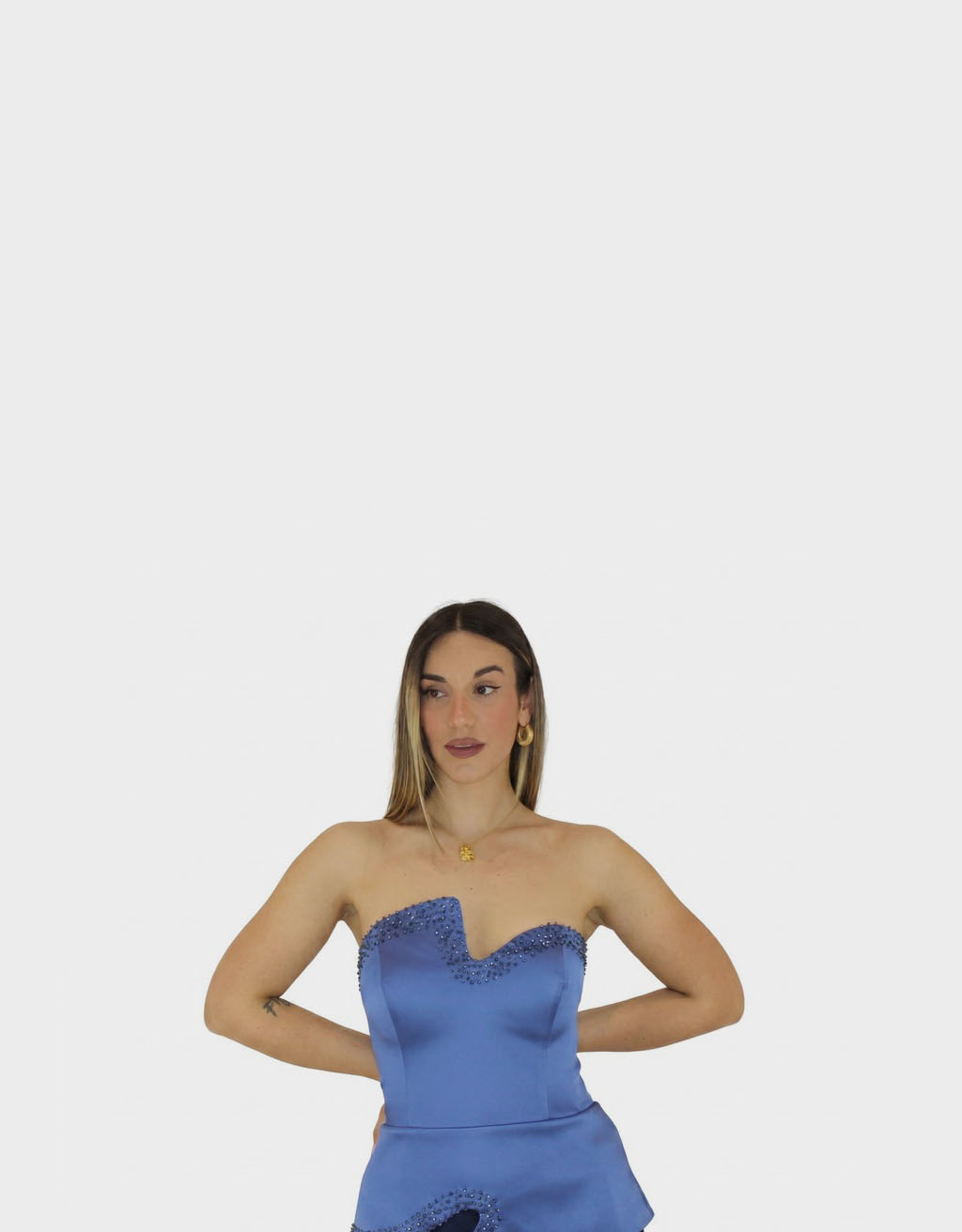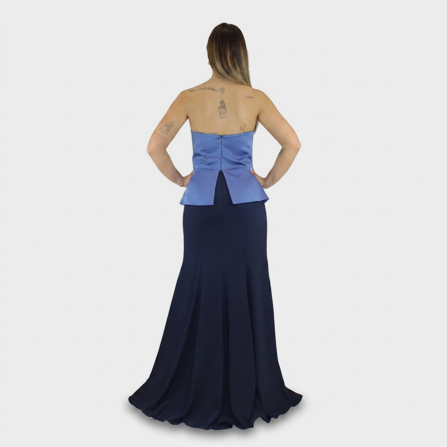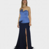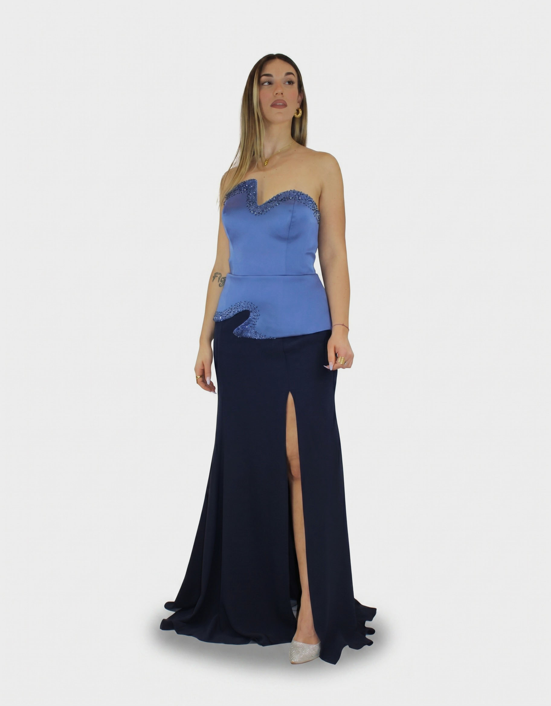 Il nuovo abito polvere e blu della nuova collezione di Elizabeth Moda è raffinato e di grande impatto visivo, questo abito unisce eleganza e modernità in un design ricercato.