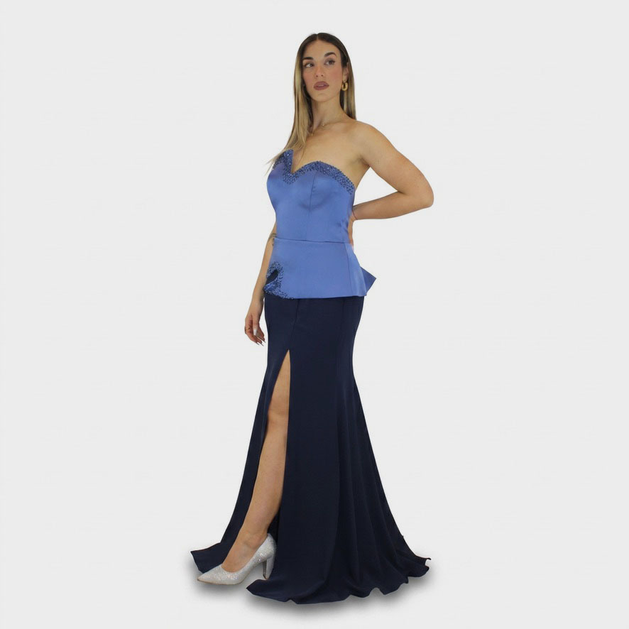 Il nuovo abito polvere e blu della nuova collezione di Elizabeth Moda è raffinato e di grande impatto visivo, questo abito unisce eleganza e modernità in un design ricercato. Lo scollo a cuore valorizza il décolleté con un tocco romantico e femminile, esaltando la silhouette con armonia. Il corpetto, impreziosito da strass luminosi, dona brillantezza e cattura la luce con discreta eleganza, creando un effetto prezioso e sofisticato. La gonna semi aderente, caratterizzata da un elegante gioco di doppio colore, slancia la figura e aggiunge profondità e originalità al look. Un capo perfetto per chi desidera distinguersi con stile, ideale per cerimonie, eventi speciali o serate eleganti.