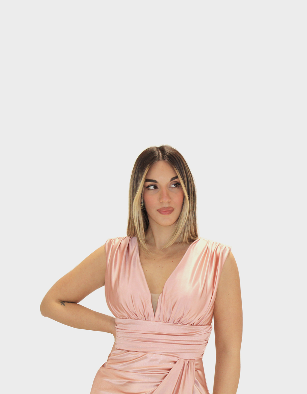 Il nuovo abito rosa della nuova collezione di Elizabeth Moda è femminile realizzato in raso elasticizzato, un tessuto luminoso e confortevole che si adatta perfettamente al corpo garantendo una vestibilità impeccabile.
