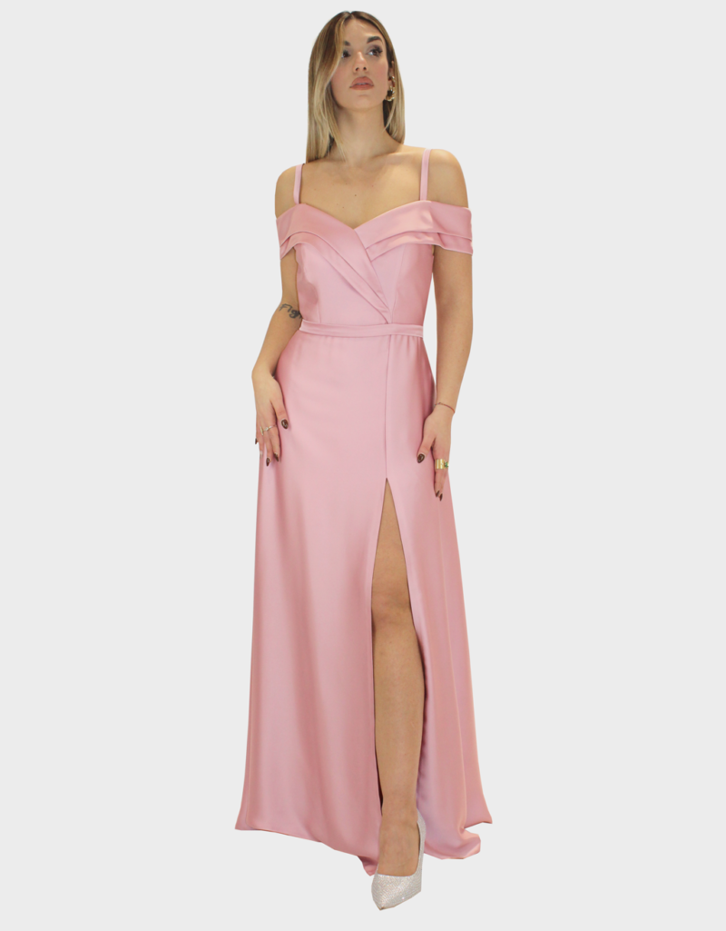 Immagina un abito da cerimonia elegante e sofisticato, realizzato interamente in tessuto di raso che conferisce un aspetto luminoso e fluido. Il corpetto aderente si adatta perfettamente alla figura, mettendo in risalto la silhouette, con un delicato scollo omerale che lascia le spalle scoperte, dando un tocco di sensualità e raffinatezza. Le bretelle sottili e graziose aggiungono un ulteriore elemento di finezza, mantenendo l’equilibrio tra eleganza e comfort. La gonna, invece, si apre dolcemente in una forma morbida e fluida, cadendo in modo naturale fino a sfiorare il pavimento, con un raffinato spacco laterale che aggiunge un movimento delicato a ogni passo. Il contrasto tra la parte superiore più aderente e la parte inferiore più fluida crea un effetto armonioso, perfetto per un evento importante. Il tessuto di raso, lucido e vellutato, conferisce una sensazione di lusso e raffinatezza, riflettendo la luce in modo morbido, rendendo questo abito ideale per una cerimonia elegante e speciale.