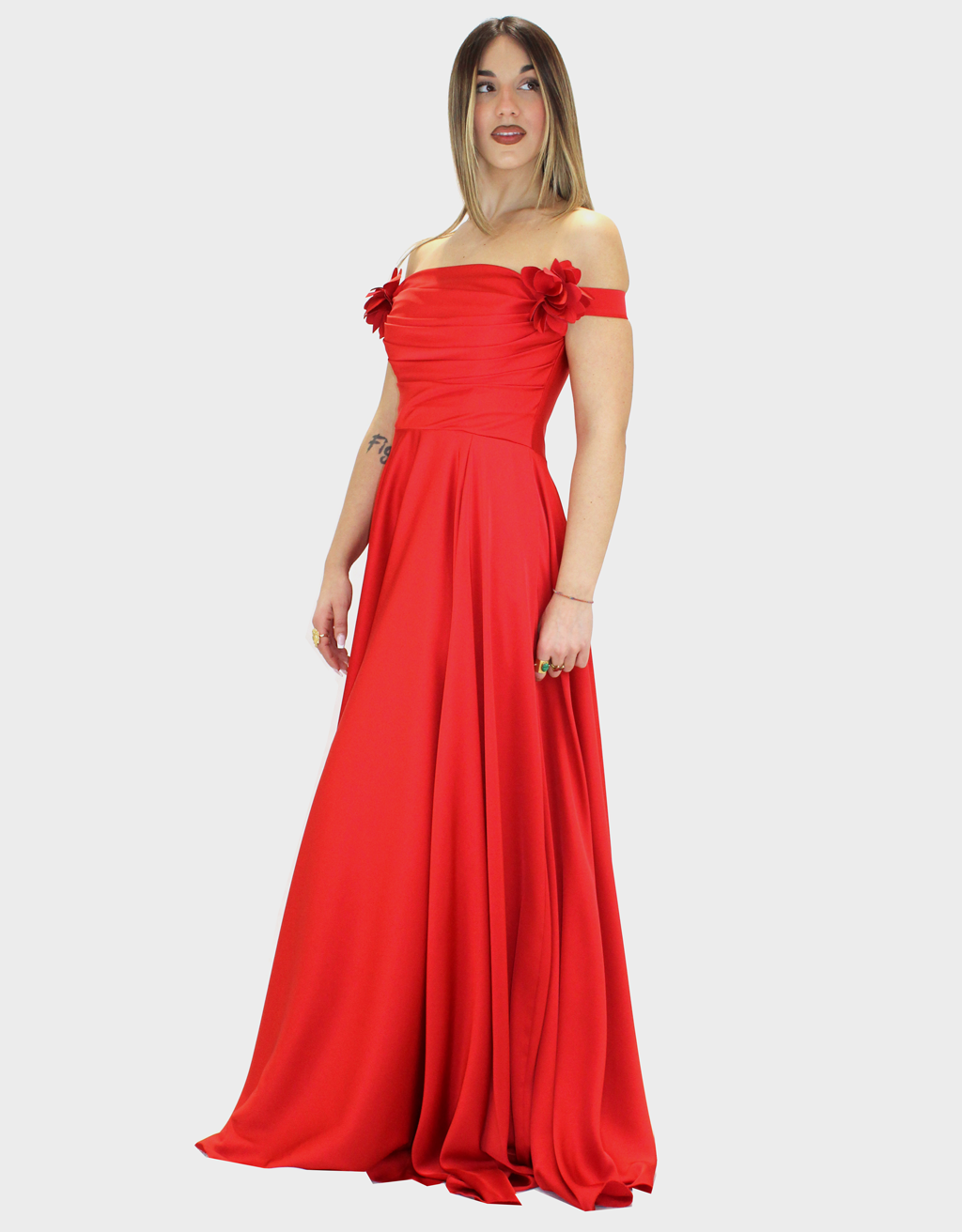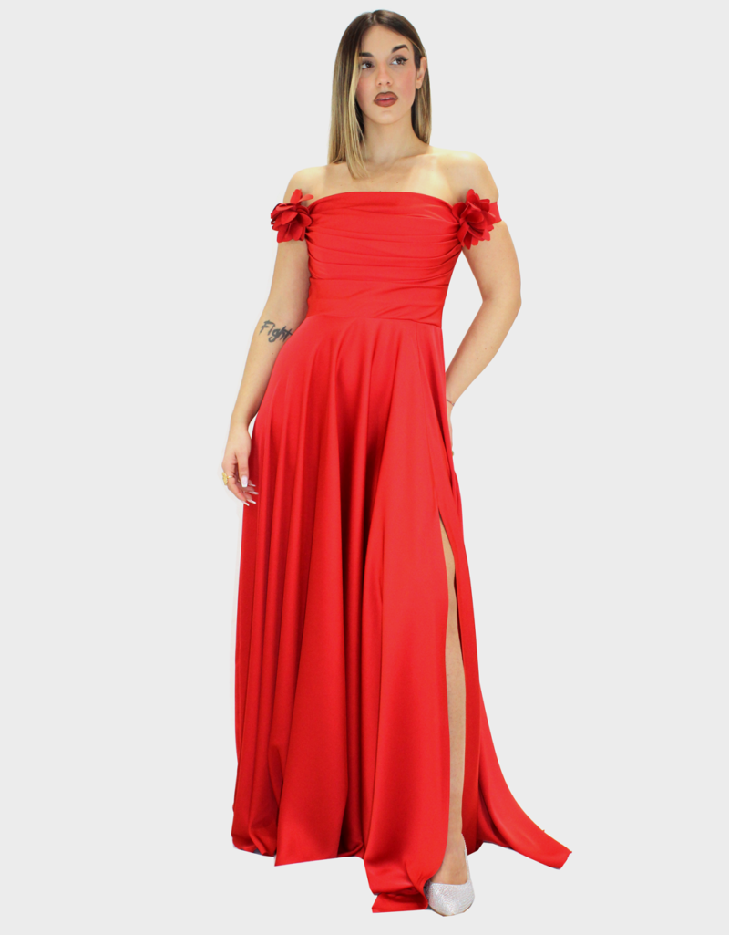 Il nuovo abito rosso della nuova collezione di Ludovica Hassler è raffinato e femminile, realizzato in luminoso tessuto di raso che accarezza la silhouette con eleganza. Il corpetto strutturato presenta un corsetto drappeggiato che valorizza il punto vita, mentre lo scollo omerale lascia delicatamente scoperte le spalle, creando un effetto romantico e sofisticato. La gonna morbida e fluida scende leggera accompagnando i movimenti con naturalezza, donando all’abito un’allure eterea. A completare il design, una spilla a forma di fiore staccabile che aggiunge un tocco prezioso e permette di personalizzare il look. Perfetto per cerimonie, eventi speciali o serate eleganti, questo abito unisce raffinatezza e versatilità in un capo dal fascino senza tempo.