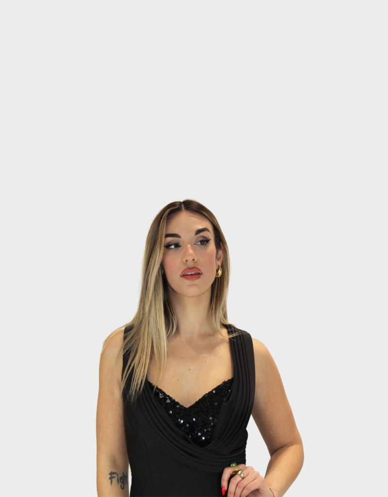 Il nuovo abito da cerimonia è elegante e raffinato, interamente realizzato in tessuto di raso lucido che cattura la luce con ogni movimento. La silhouette aderente si modella delicatamente sulla figura, mentre il corpetto è impreziosito da una cascata di strass scintillanti che creano un effetto luminoso e sofisticato. Gli strass si distribuiscono in modo strategico, esaltando il decolleté e aggiungendo un tocco di glamour senza esagerare. Il modello presenta un elegante spacco laterale che dona al vestito un’accattivante sensualità, mantenendo al contempo l’eleganza. La gonna fluida scivola dolcemente verso il basso, completando il look con un tocco di movimento. Perfetto per occasioni speciali, questo abito è la scelta ideale per chi cerca una creazione raffinata, ma al tempo stesso audace, per distinguersi in ogni cerimonia.
