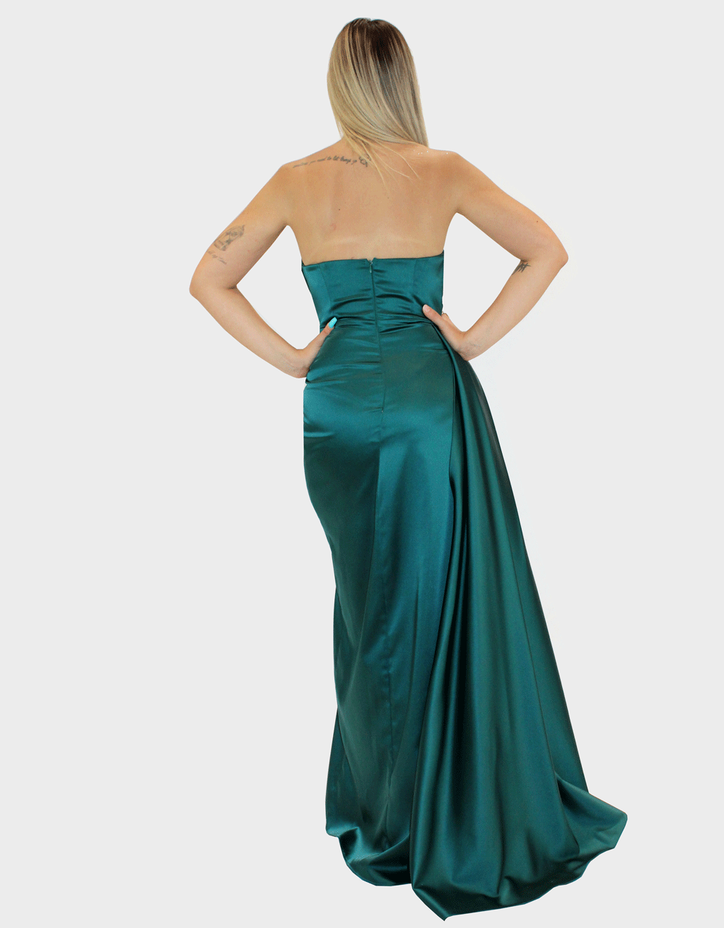 Il nuovo abito verde della collezione di Elizabeth Moda trasuda eleganza e glamour, pensato per catturare l’attenzione e incantare in ogni occasione speciale. L’abito è confezionato in raso, noto per la sua lucentezza e morbidezza, che conferisce un effetto drappeggiato fluido e raffinato. Il design dell’abito è caratterizzato da drappeggiature artistiche che scendono con grazia lungo il corpo. Queste drappeggiature aggiungono un senso di movimento e fluidità. Un dettaglio sensuale è dato dal profondo spacco che si apre su una delle gambe, rivelando appena la pelle e permettendo un movimento elegante. La coda dell’abito, lunga e fluente, segue con grazia ogni passo. Lo scollo dell’abito è di tipo puntale, un dettaglio affilato e moderno che crea un contrasto affascinante con le linee morbide del drappeggio. Questo abito da cerimonia è pensato per la donna che desidera sentirsi regale e affascinante.