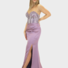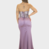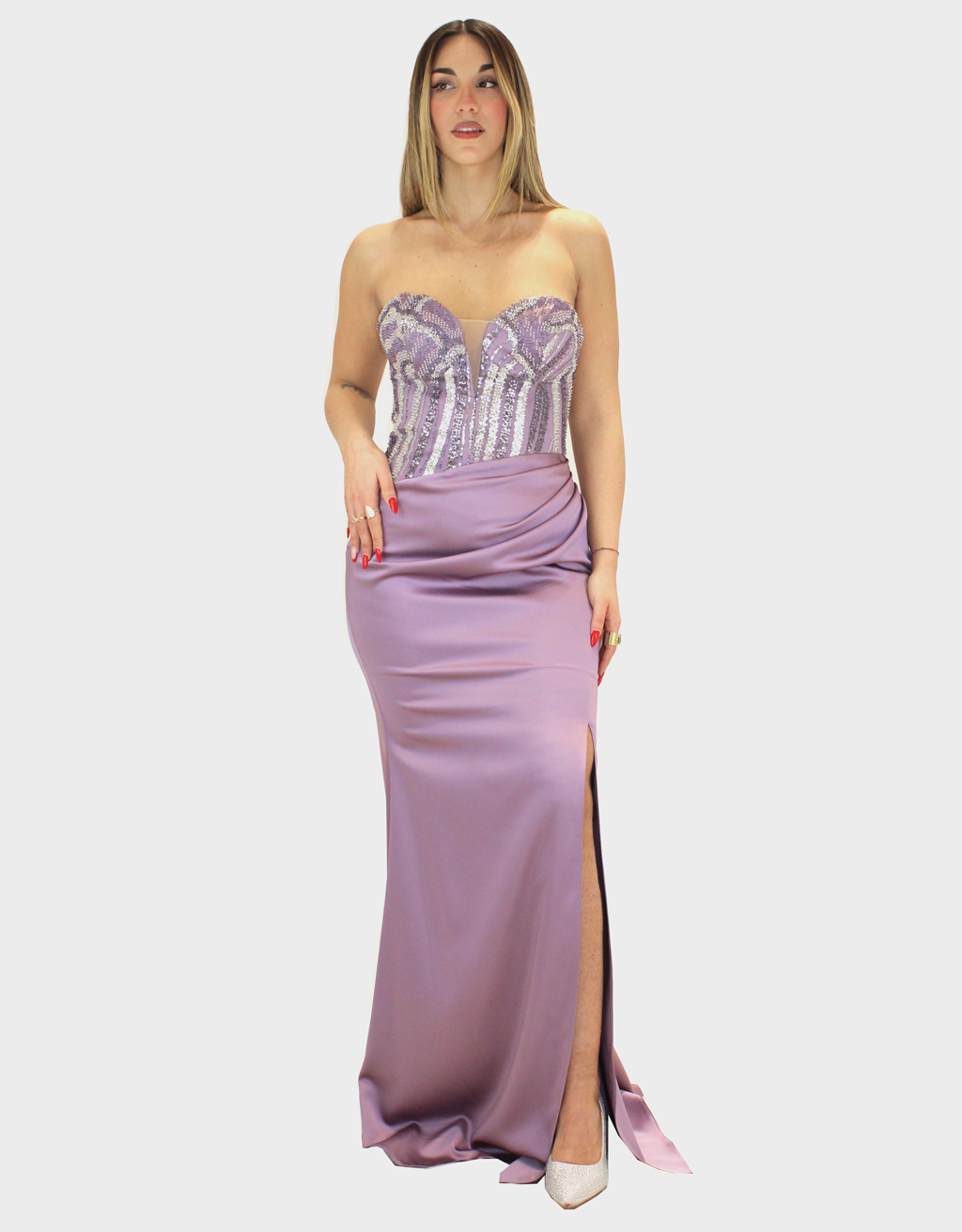 Il nuovo abito viola della collezione di Elizabeth Moda è dal carattere deciso e sofisticato, pensato per valorizzare la femminilità con dettagli preziosi. Il corsetto strutturato definisce il busto con eleganza, mentre lo scollo a cuore mette in risalto il décolleté con un tocco romantico e sensuale. Il corpetto è interamente arricchito da paillettes luminose, che donano brillantezza e profondità al design, catturando la luce a ogni movimento. La gonna in raso, fluida e setosa, è impreziosita da un raffinato drappeggio che esalta la silhouette, accompagnato da uno spacco laterale che aggiunge dinamismo e un’allure seducente. Un abito ideale per cerimonie ed eventi serali, perfetto per chi desidera un look elegante, scenografico e di grande impatto.