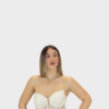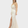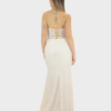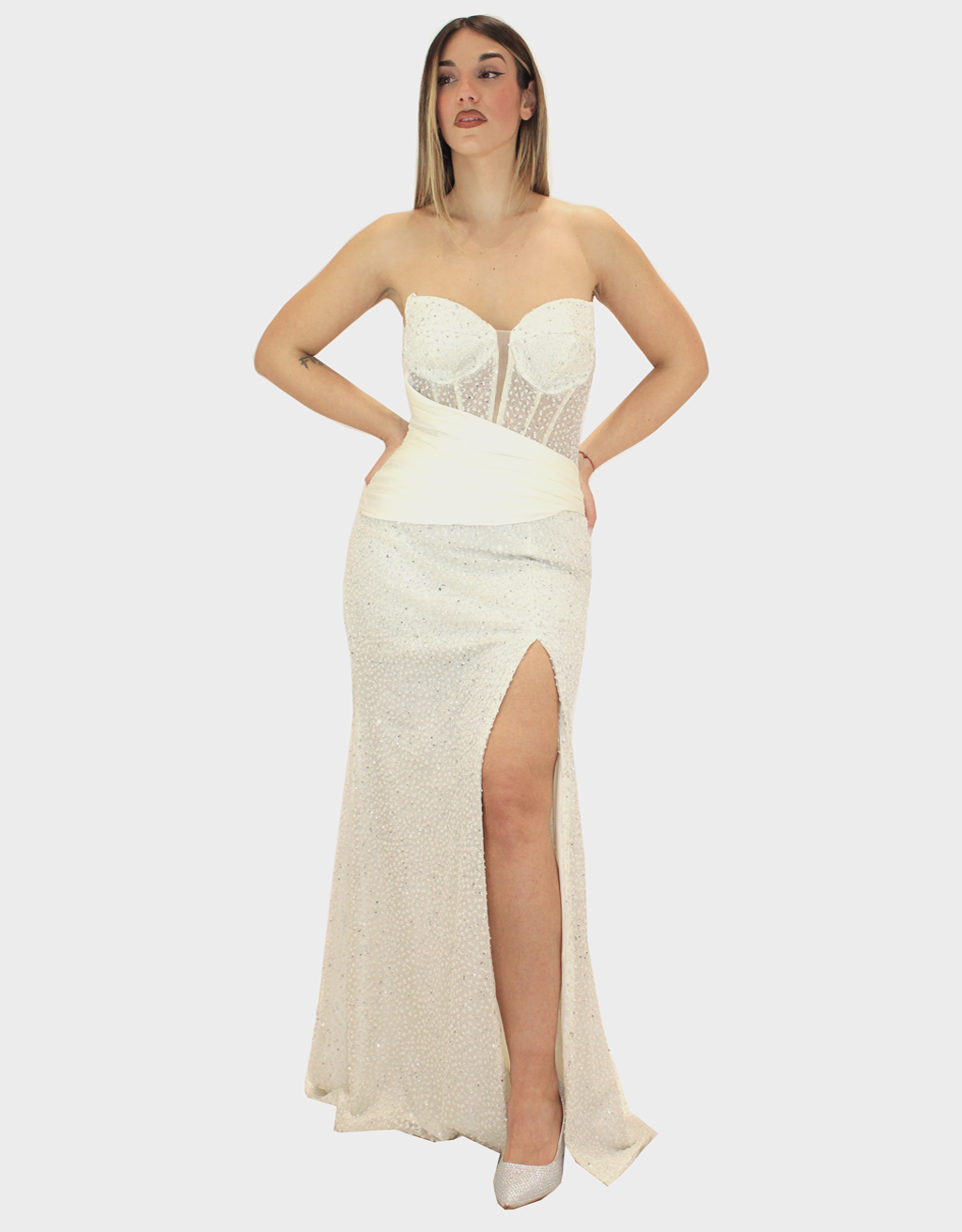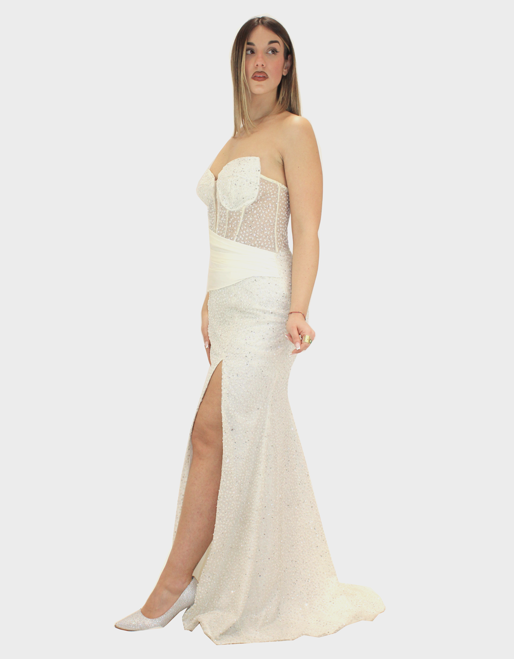 Il nuovo abito bianco della nuova collezione di Elizabeth Moda è lungo dal fascino elegante e luminoso, caratterizzato da una silhouette a sirena che avvolge la figura e si apre delicatamente sul fondo, valorizzando la silhouette con femminilità. Il scollo a cuore mette in risalto il décolleté con una linea romantica e raffinata. Il tessuto è completamente brillantinato, creando un effetto luminoso e scenografico che cattura la luce ad ogni movimento. Sul punto vita è presente una fascia in raso drappeggiata sull’addome, un dettaglio elegante che definisce la figura e aggiunge un raffinato gioco di volumi. La gonna presenta uno spacco frontale che slancia la figura e dona movimento all’abito, mantenendo un perfetto equilibrio tra sensualità ed eleganza. Un abito ideale per serate di gala, cerimonie ed eventi speciali, pensato per chi desidera un look sofisticato e di grande impatto.