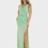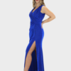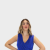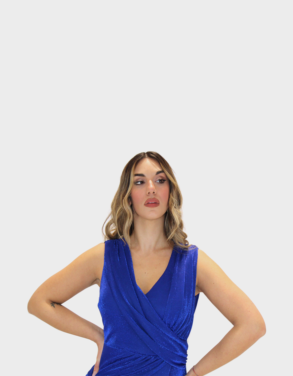 Il nuovo abito blu della nuova collezione di Sharon lungo dal design raffinato e luminoso, realizzato in tessuto lurex che cattura la luce con eleganza. Il modello a giromanica presenta uno scollo a V che valorizza il décolleté con femminilità e armonia. La linea segue la silhouette in modo naturale, mentre lo spacco dona movimento e un tocco sensuale. Il drappeggio sul davanti arricchisce il capo con un raffinato gioco di volumi, studiato per slanciare la figura. Un abito ideale per eventi serali, cerimonie e occasioni speciali dal carattere glamour.