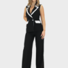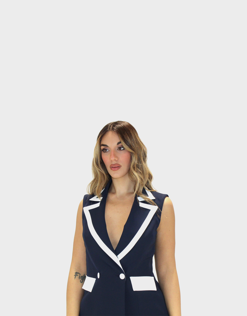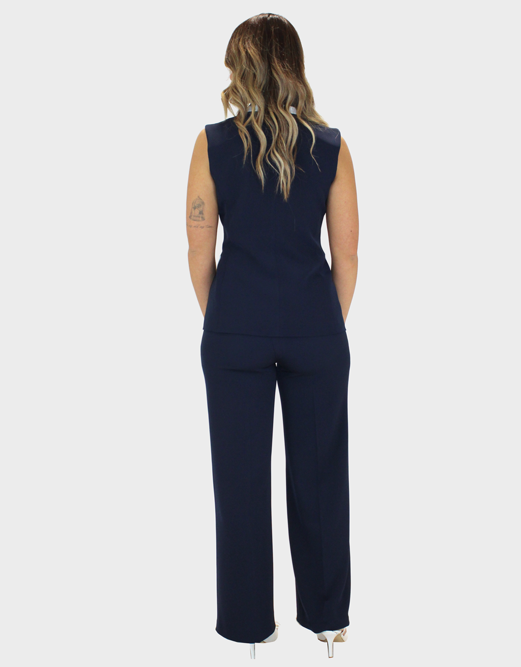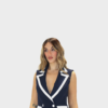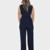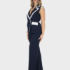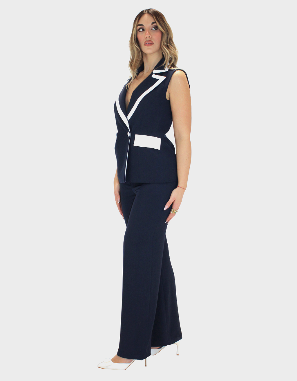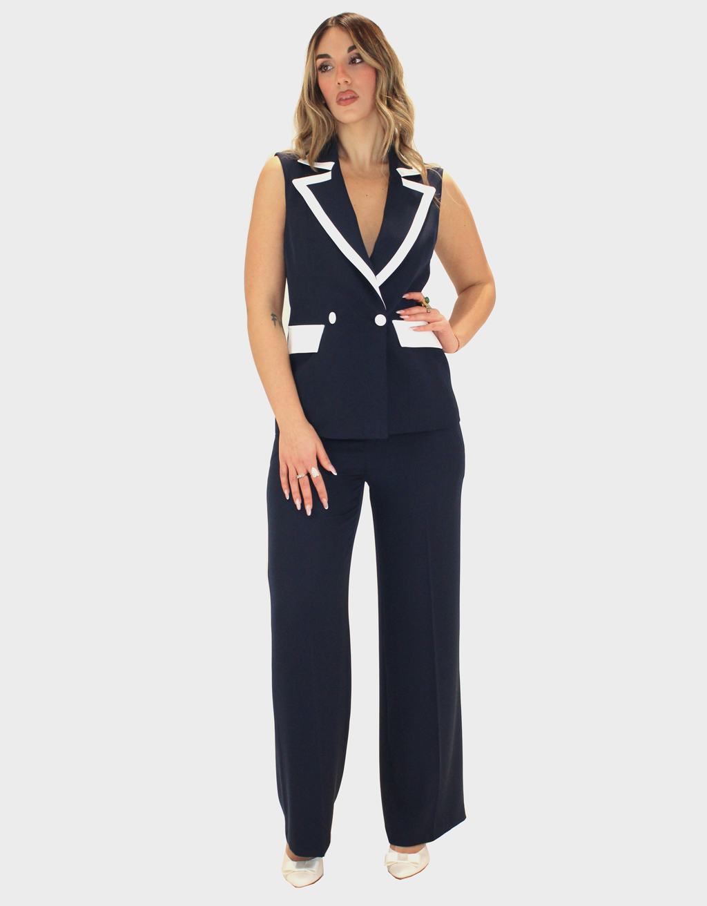 Completo due pezzi blu della nuova collezione di Sharon dal design moderno e raffinato, composto da una giacca a giromanica dal taglio pulito ed essenziale.Completo due pezzi dal design moderno e raffinato, composto da una giacca a giromanica dal taglio pulito ed essenziale. La giacca è valorizzata da uno scollo a contrasto in bianco, che crea un elegante gioco cromatico e dona luminosità al capo. Il pantalone palazzo, dalla linea ampia e fluida, slancia la silhouette garantendo comfort e stile. Il taglio sartoriale assicura una vestibilità impeccabile, valorizzando la figura con naturalezza. Il completo può essere indossato insieme per un look coordinato e sofisticato oppure separatamente per creare outfit versatili. Perfetto per contesti professionali, eventi eleganti o occasioni speciali dal gusto contemporaneo.