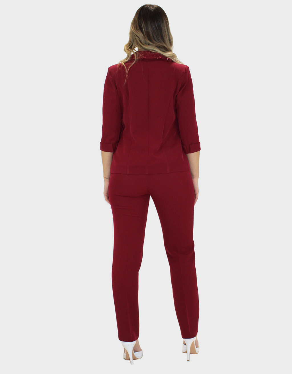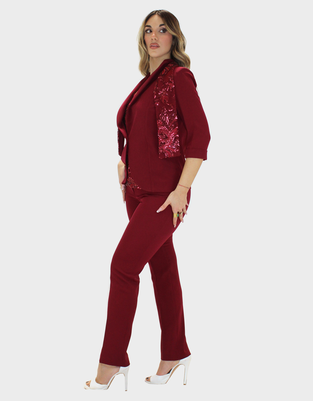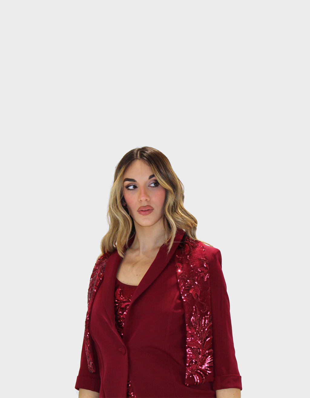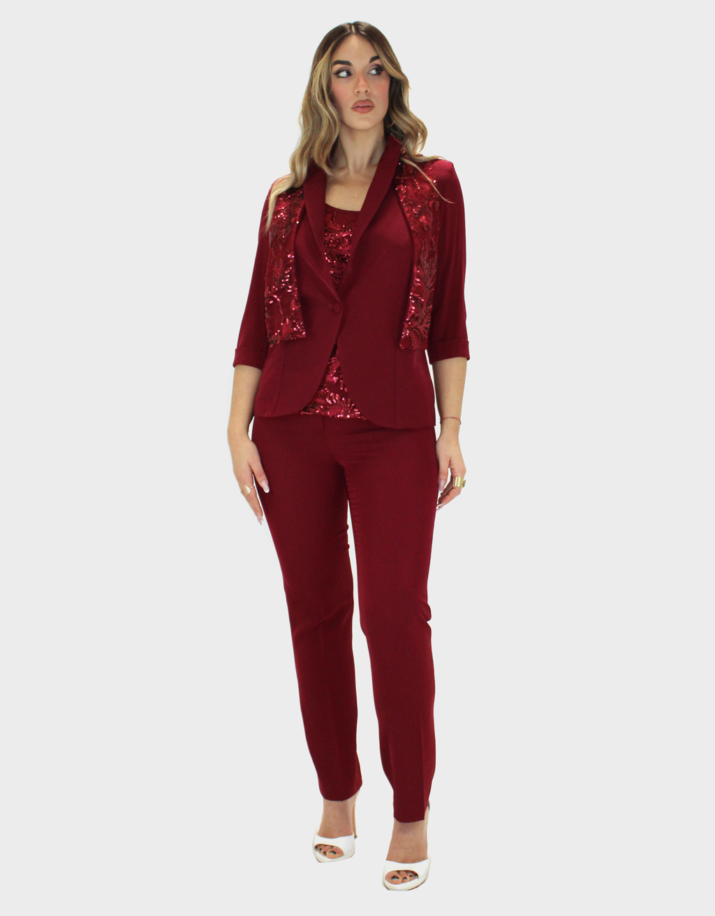 Il nuovo abito completo tre pezzi bordeaux della nuova collezione di Paola Forti è un perfetto capo dal gusto raffinato e contemporaneo, pensato per occasioni eleganti.