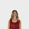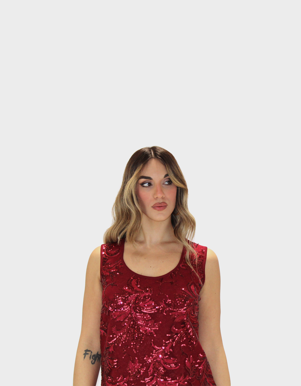 La blusa è realizzata in tessuto interamente impreziosito da strass luminosi, che catturano la luce creando un effetto brillante e scenografico. Il design elegante valorizza il décolleté e dona carattere al look, rendendolo ideale per eventi serali e occasioni speciali. Il pantalone classico in cady completa il completo con equilibrio e raffinatezza: la sua linea pulita e la caduta impeccabile slanciano la silhouette, garantendo comfort e vestibilità perfetta.