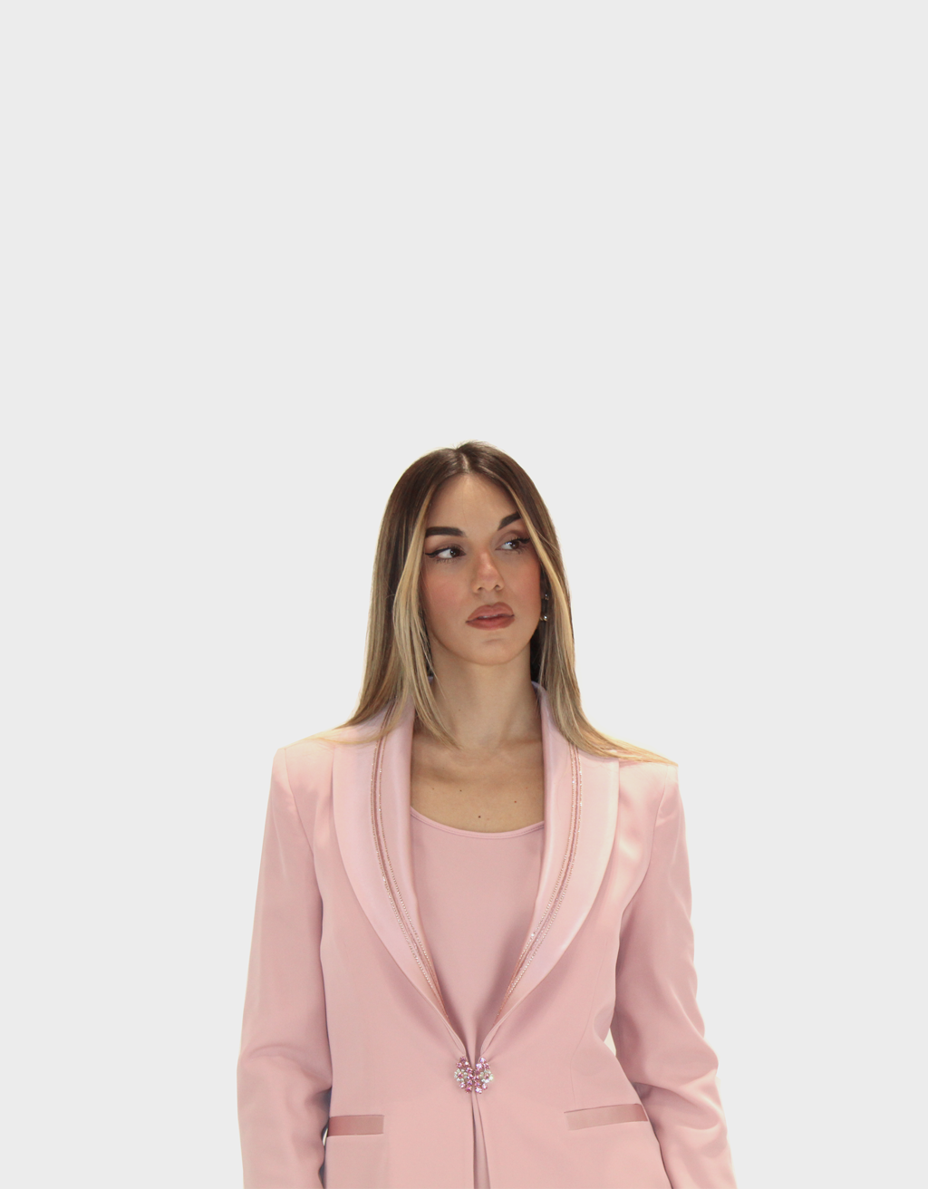 Il nuovo completo tre pezzi rosa è un capo elegante e sofisticato, perfetto per un’occasione speciale. La giacca, realizzata in un tessuto pregiato, ha un taglio impeccabile, aderente ma non troppo stretto, che esalta la figura con raffinatezza. I dettagli sono ricercati: il bottone gioiello, un elemento di alta classe, è posizionato al centro della giacca, con una finitura brillante che cattura la luce, donando un tocco di lusso discreto. Il collo, in morbido raso, è una delle caratteristiche distintive del look, elegante e lucente, che conferisce una sensazione di ricercatezza e freschezza, arricchendo il design del completo con un contrasto raffinato rispetto al resto del capo. La giacca può essere accompagnata da pantaloni o una gonna dal taglio elegante e minimalista, in tono con la giacca per mantenere l’armonia del look. Il tessuto è lucido ma sobrio, evitando effetti troppo vistosi ma sempre mantenendo un’aria di grande classe.