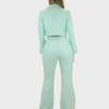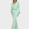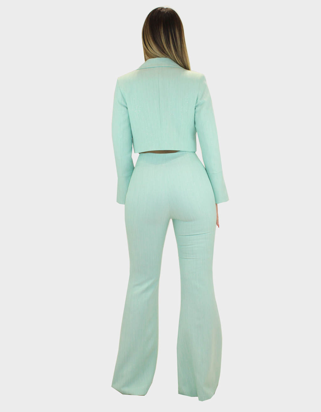 Il nuovo completo verde della collezione di Sharon è dal gusto sartoriale e contemporaneo, realizzato in pregiato tessuto Cady leggermente gessato