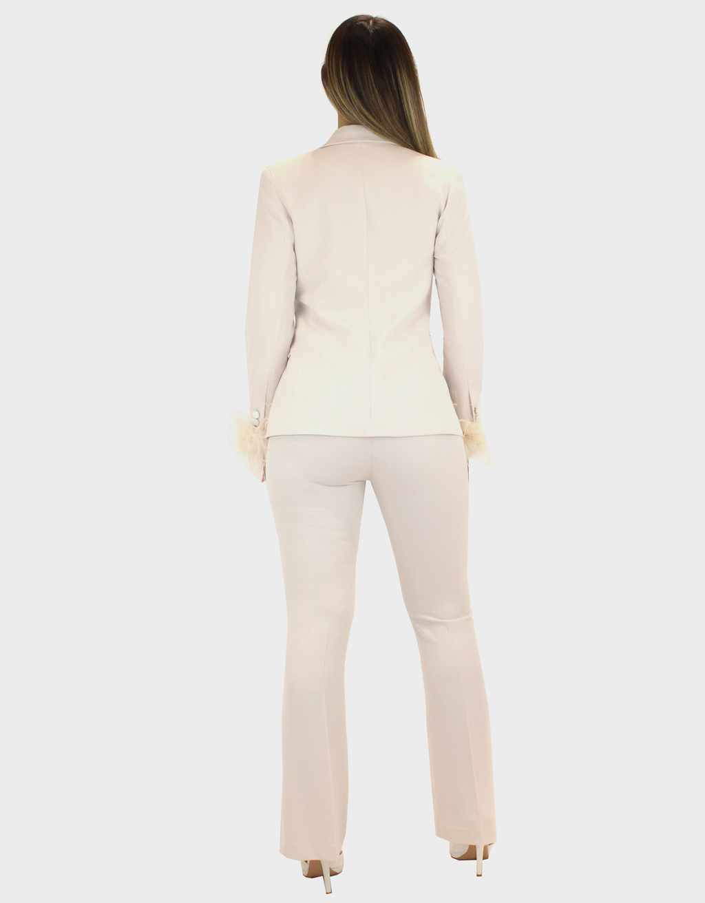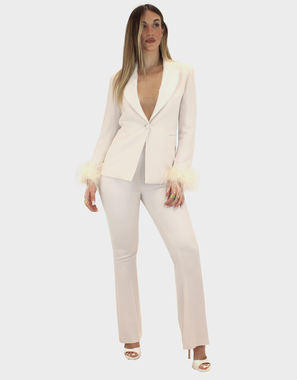 Il nuovo tailleur beige della nuova collezione di Elizabeth Moda è sofisticato e di grande personalità, pensato per una donna che ama distinguersi con classe. La linea pulita e strutturata valorizza la silhouette con equilibrio, creando un look raffinato e contemporaneo. La giacca si impreziosisce con un elegante collo in raso, che dona luminosità e un raffinato contrasto materico, esaltando l’allure del completo. Le piume applicate sulle maniche aggiungono un tocco glamour e ricercato, regalando movimento e carattere al design. Perfetto per cerimonie, eventi esclusivi o serate importanti, questo tailleur unisce femminilità, modernità e dettagli di tendenza in un capo di assoluto stile.