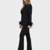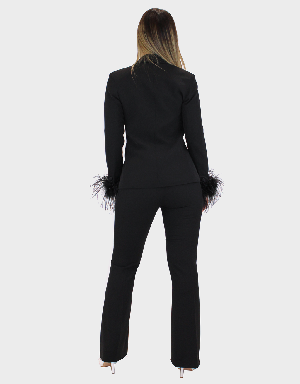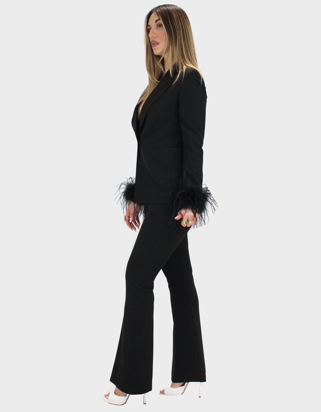 Il nuovo tailleur nero della nuova collezione di Elizabeth Moda è sofisticato e di grande personalità, pensato per una donna che ama distinguersi con classe. La linea pulita e strutturata valorizza la silhouette con equilibrio, creando un look raffinato e contemporaneo. La giacca si impreziosisce con un elegante collo in raso, che dona luminosità e un raffinato contrasto materico, esaltando l’allure del completo. Le piume applicate sulle maniche aggiungono un tocco glamour e ricercato, regalando movimento e carattere al design. Perfetto per cerimonie, eventi esclusivi o serate importanti, questo tailleur unisce femminilità, modernità e dettagli di tendenza in un capo di assoluto stile.