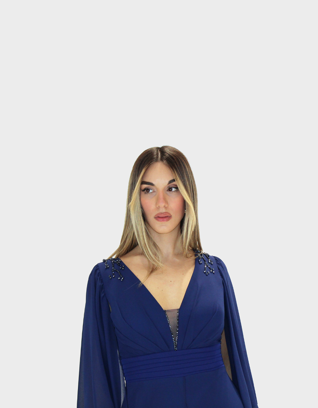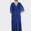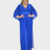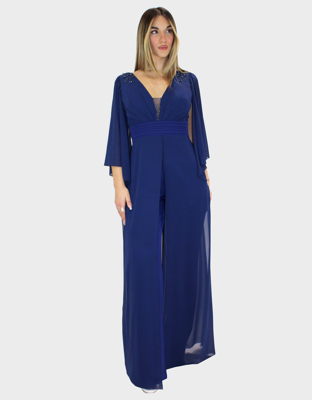 La nuova tuta blu notte della nuova collezione di Paola Forti è realizzata in leggero chiffon, ideale per cerimonie ed eventi speciali.