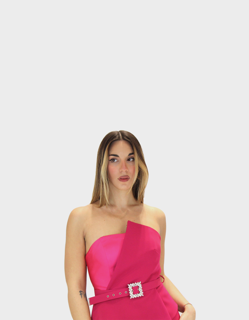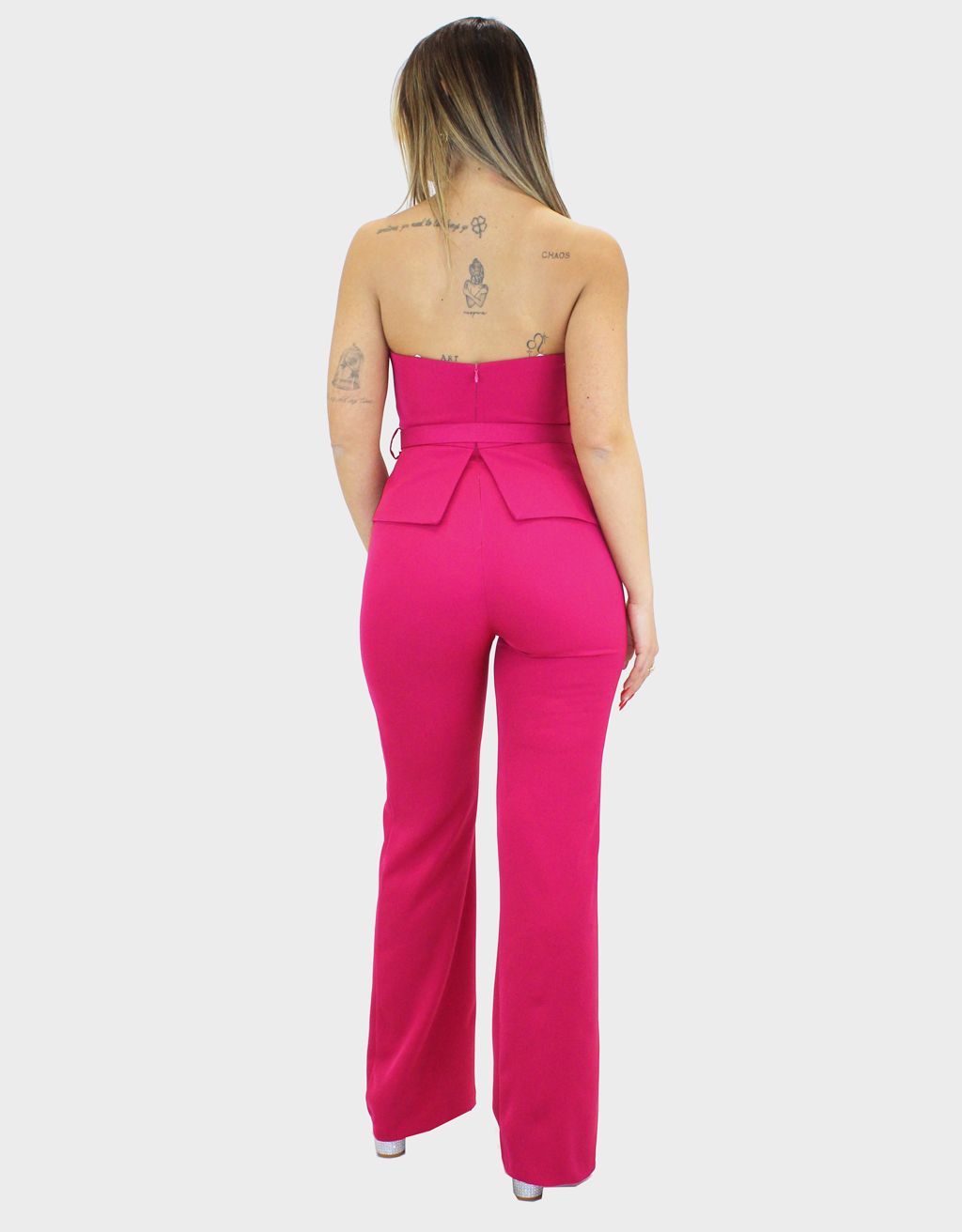 La nuova tuta fucsia della nuova collezione di Sharon è raffinata e femminile dal design essenziale ma ricercato. Il modello presenta uno scollo dritto che valorizza il décolleté con sobria eleganza, conferendo al capo una linea pulita e moderna. Il corpino è studiato per offrire una vestibilità armoniosa, mettendo in risalto la parte superiore della figura. In vita, la cintura impreziosita da strass rappresenta un raffinato punto luce, definendo il punto vita e donando luminosità all’intero look. Il dettaglio della baschina contribuisce a slanciare e armonizzare la silhouette, creando un effetto visivamente snellente. Il pantalone palazzo, ampio e fluido, completa il design con eleganza e movimento, assicurando comfort e una caduta impeccabile. Una tuta ideale per cerimonie, eventi eleganti e occasioni speciali, perfetta per chi desidera uno stile sofisticato e femminile.