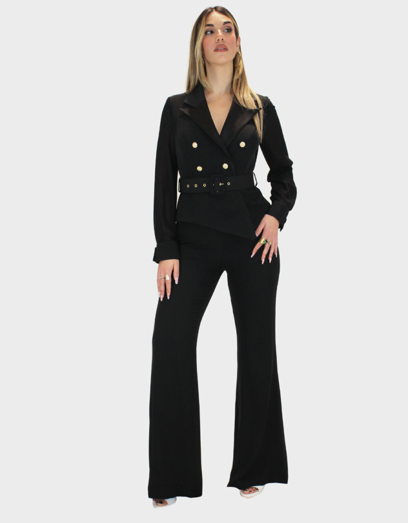 La nuova tuta nera della nuova collezione di Sharon è femminile, pensata per unire eleganza e comfort in un unico capo.