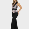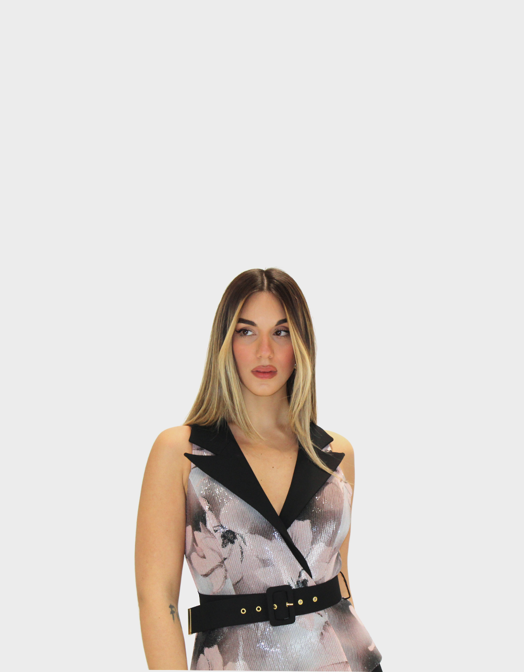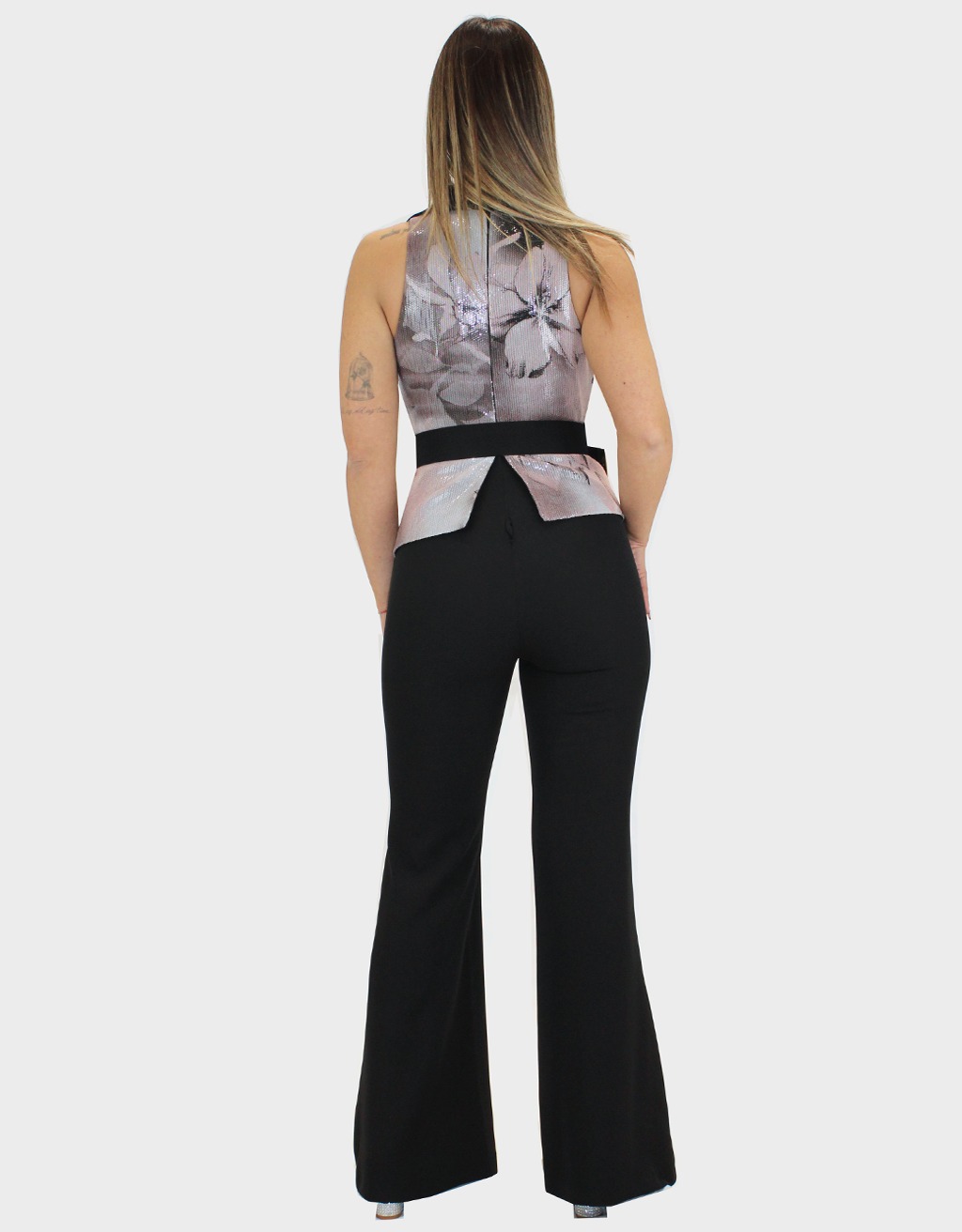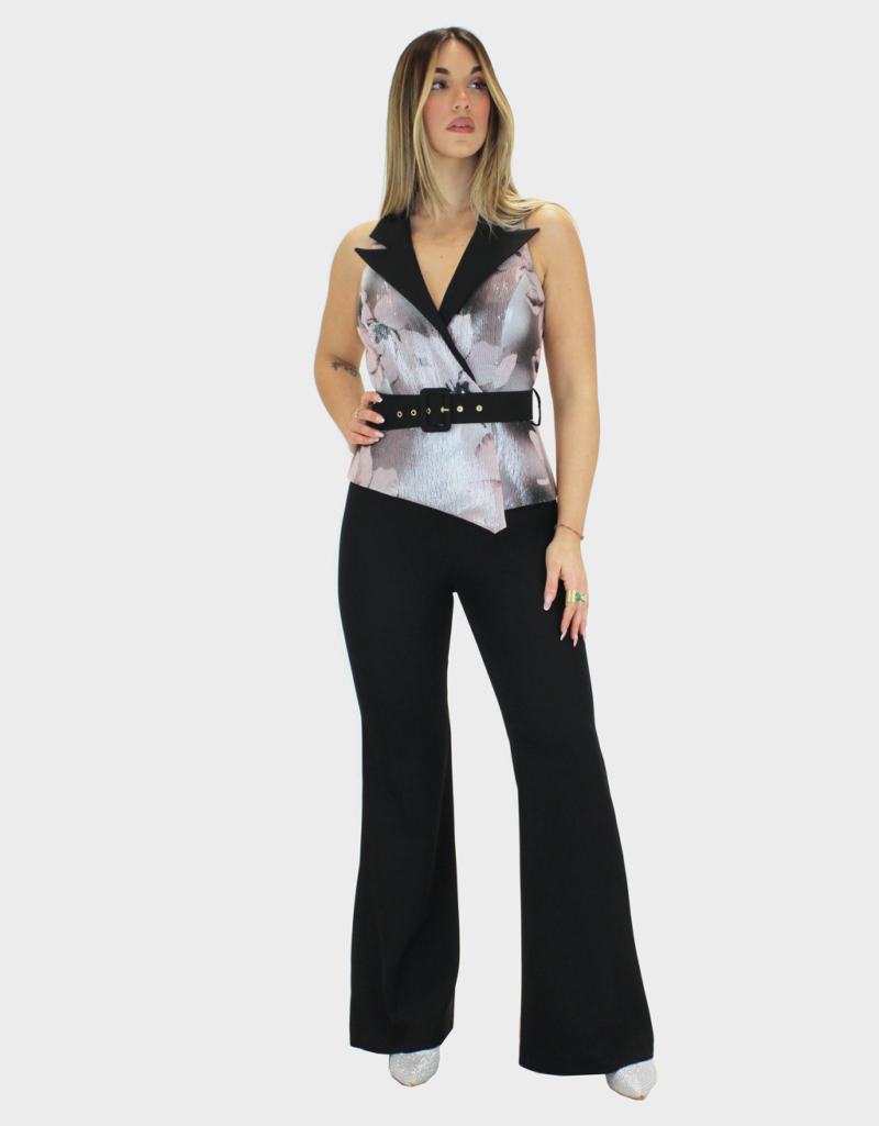 Il pantalone è caratterizzato da una vestibilità classica, con una linea pulita e confortevole che slancia la figura e garantisce una caduta impeccabile. In vita, la cintura definisce il punto vita con eleganza, mentre il dettaglio della baschina contribuisce ad assottigliare la silhouette femminile, creando un effetto armonioso e valorizzante. Una tuta versatile e ricercata, perfetta per eventi speciali, cerimonie ed occasioni eleganti, ideale per la donna che desidera un look sofisticato, femminile e contemporaneo.