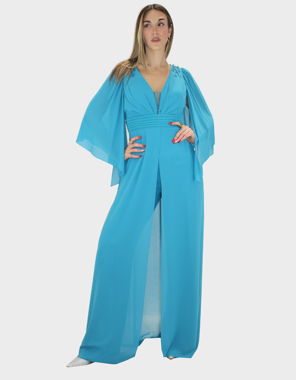 La nuova tuta verde della nuova collezione di Paola Forti è realizzata in leggero chiffon, ideale per cerimonie ed eventi speciali.