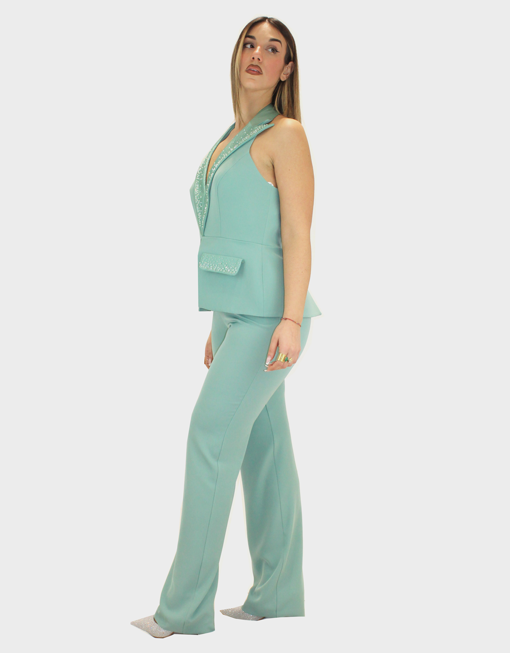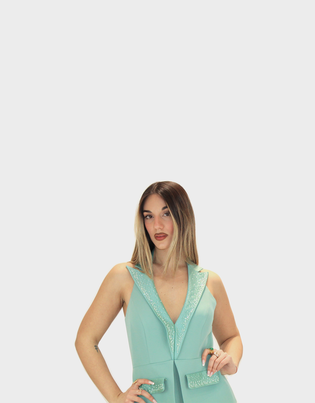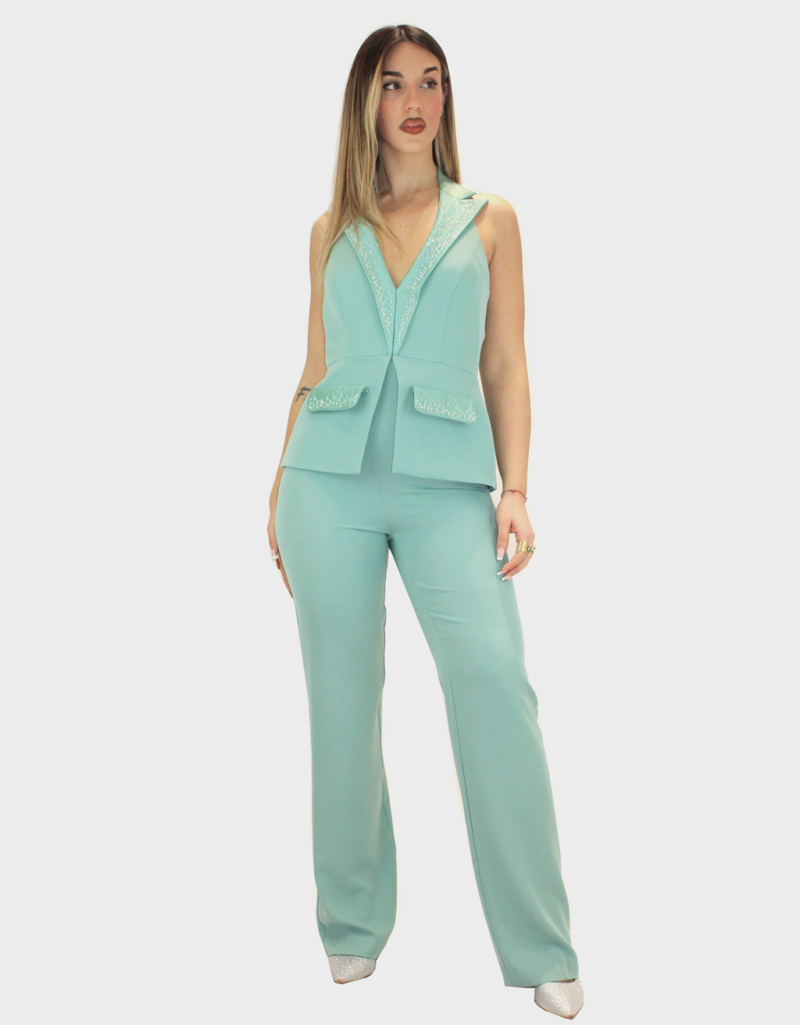La nuova tuta verde della nuova collezione di Sharon è femminile dal design ricercato, pensata per valorizzare la silhouette con stile ed eleganza. Il modello presenta un collo all’americana impreziosito da luminosi strass applicati lungo il profilo, che donano un raffinato punto luce e incorniciano il décolleté con grande classe. La scollatura a V sul davanti aggiunge femminilità e slancia la figura, mantenendo un equilibrio perfetto tra sensualità ed eleganza.